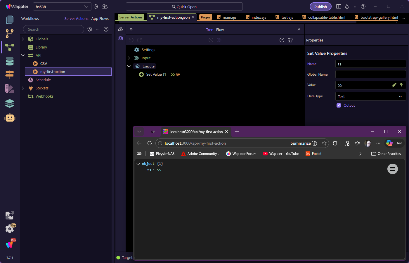 I have created a test API and set a value in the Execute step. I also enabled the output. However, when I fire the API using domain/api/test-one, it does not return any values.