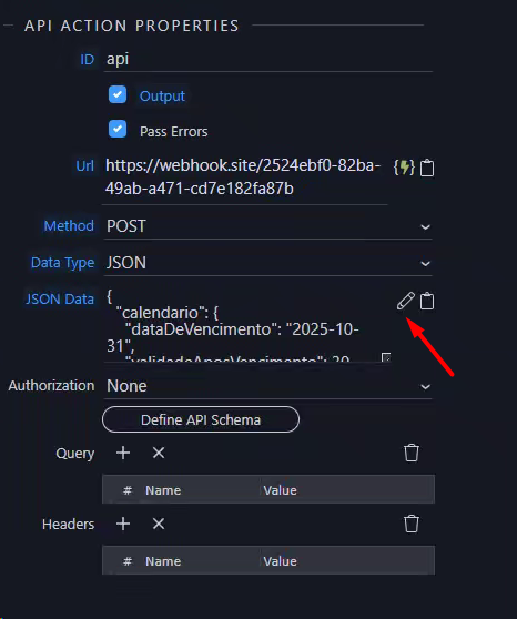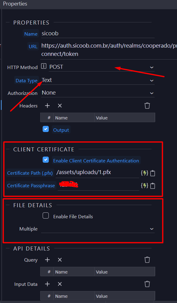 In this case, it would have the same properties as the File Upload Action API action, adding only methods that can be changed dynamically and containing the digital certificate file path and password.
