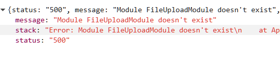 The full wording on the error is here: ``{ "status": "500", "message": "Module FileUploadModule doesn't exist", "stack": "Error: Module FileUploadModule doesn't exist\n at App._exec (C:\Users\micro\Documents\aaawwwroot\redacted\lib\core\app.js:737:19)\n at App._exec (C:\Users\micro\Documents\aaawwwroot\redacted\lib\core\app.js:716:20)\n at async App.exec (C:\Users\micro\Documents\aaawwwroot\redacted\lib\core\app.js:682:5)\n at async App.define (C:\Users\micro\Documents\aaawwwroot\redacted\lib\core\app.js:664:5)" }``