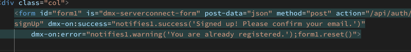 dmx-on:success="notifies.success('Thank you, your comment has been sent and we will contact you.')"
