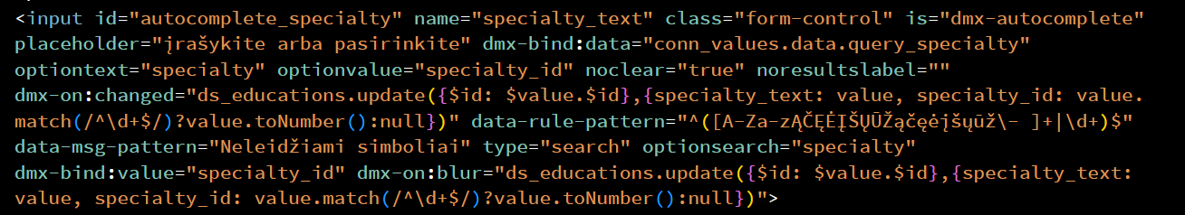 etc. payload: specialty_id":null,"specialty_text":"testtext", I cannot find a way to preload to autocomplete field "testtext" from this exhample. Preloading with specialty_id works just fine. Any thougts and if it’s a hard limit of autocomplete component maybe any of you have any other suggestion (I was thinking maybe to build another DB just to store specialty_text and get specialty_text_id from there only for this as a walkaround etc?)?