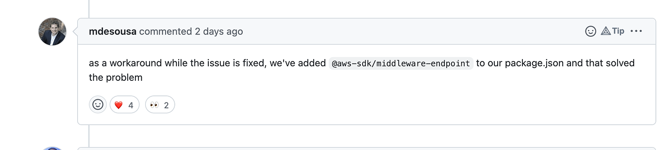 "message": "Cannot find module '@aws-sdk/middleware-endpoint'\nRequire stack:\n- /opt/node_app/node_modules/@aws-sdk/s3-request-presigner/dist-cjs/getSignedUrl.js\n- /opt/node_app/node_modules/@aws-sdk/s3-request-presigner/dist-cjs/index.js\n- /opt/node_app/lib/modules/s3.js\n- /opt/node_app/lib/core/app.js\n- /opt/node_app/lib/core/middleware.js\n- /opt/node_app/lib/setup/routes.js\n- /opt/node_app/lib/server.js\n- /opt/node_app/index.js",
