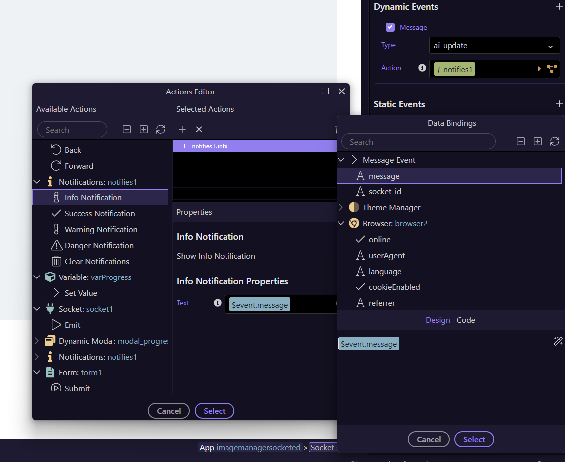 The returned socket messages can be captured via the dynamic message event of the app connect component and displayed however you with. A simple notification works well.