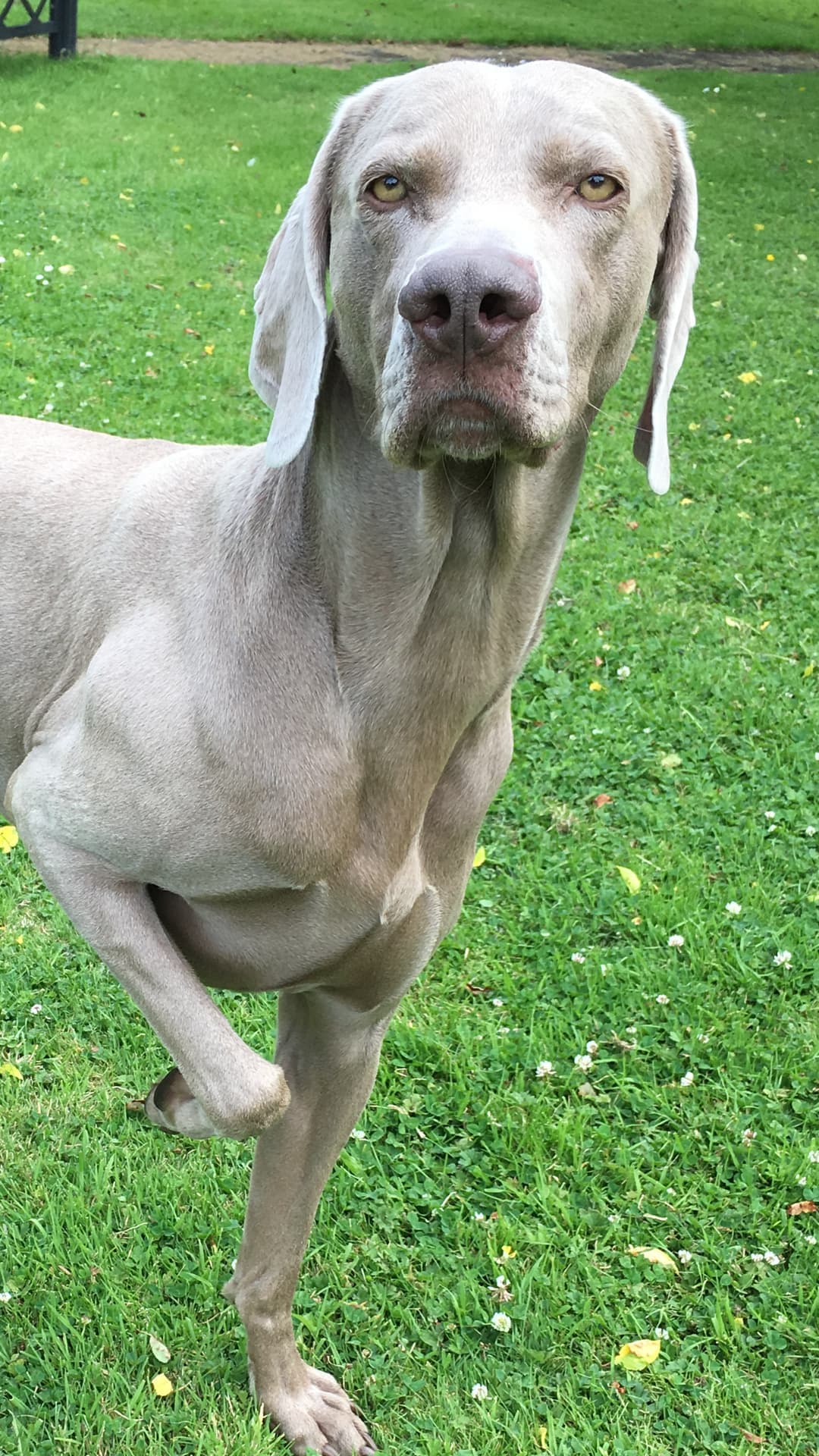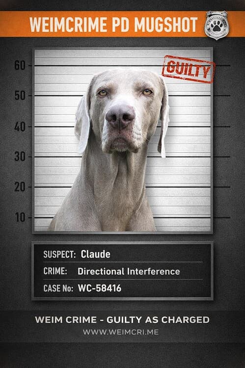Visual tone: • Clean • High-contrast • Professional • Slightly ironic The output must look like a real investigative asset created by a police department that happens to deal exclusively with Weimaraners. we need to create a WEIM CRIME MUGSHOT TEMPLATE using the supplied image make sure the image is an accurate lifelike depiction of the supplied photo do not change the eyes or the face - show only the dogs head and shoulders, no paws- medium quality1 Canvas Sizenon-transparent canvas- 1080×1350 Meta‑optimised portrait- Weim Grey #7A7F862 Background LayerMugshot Height Chart- Horizontal black lines every 80px- Line thickness: 4px- Numbers on left side: 20, 30, 40, 50, 60 Oswald Bold, Mugshot Black #1A1A1A- Slight vignette around edges 3. Photo Area Centered square frame- 900×900- Thin Gunmetal border #4A4F55- Drop shadow: subtle, 20% opacity- This is where the Weimaraner photo goes4. Header BarTop Banner:- Background: Evidence Tag Orange #FF7A21- Height: 120px- Text: WEIMCRIME MUGSHOT- Font: Oswald Bold, white, 90pt- Alignment: centered- on right hand side police badge with a pawprint in the centre5. Suspect Plate Under PhotoBlack rectangle- Height: 180px- Width: 100%- Background: Mugshot Black #1A1A1A- Text in white Oswald Medium, 60ptFields:- SUSPECT: [Claude]- CRIME: [Bin Diving]- CASE #: WC‑[0124]Spacing:- Each field on its own line- Left‑aligned- 80px padding on left and right6. Stamp Overlay - GUILTY red distressed stamp transparent stamp backgroundPlacement:- Top‑right corner of the photo- 20° rotation for style7. Footer BarBottom Banner:- Background: Gunmetal #4A4F55- Height: 100px- Text:- “WEIM CRIME — GUILTY AS CHARGED”- Font: Inter Medium, white, 48pt- Centered- small centered text at bottom displaying website address: WWW.WEIMCRI.ME