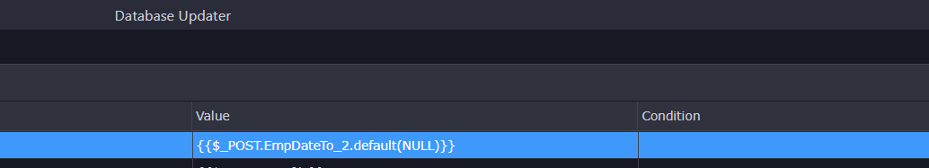 Case 2: Sending an empty input is only neccesary declare the dafault value from the database, in this case like the column accepts NULL you should provide default valur in “Value” column in database updater and not Condition. {{$_POST.EmpDateTo_2.default(NULL)}}.