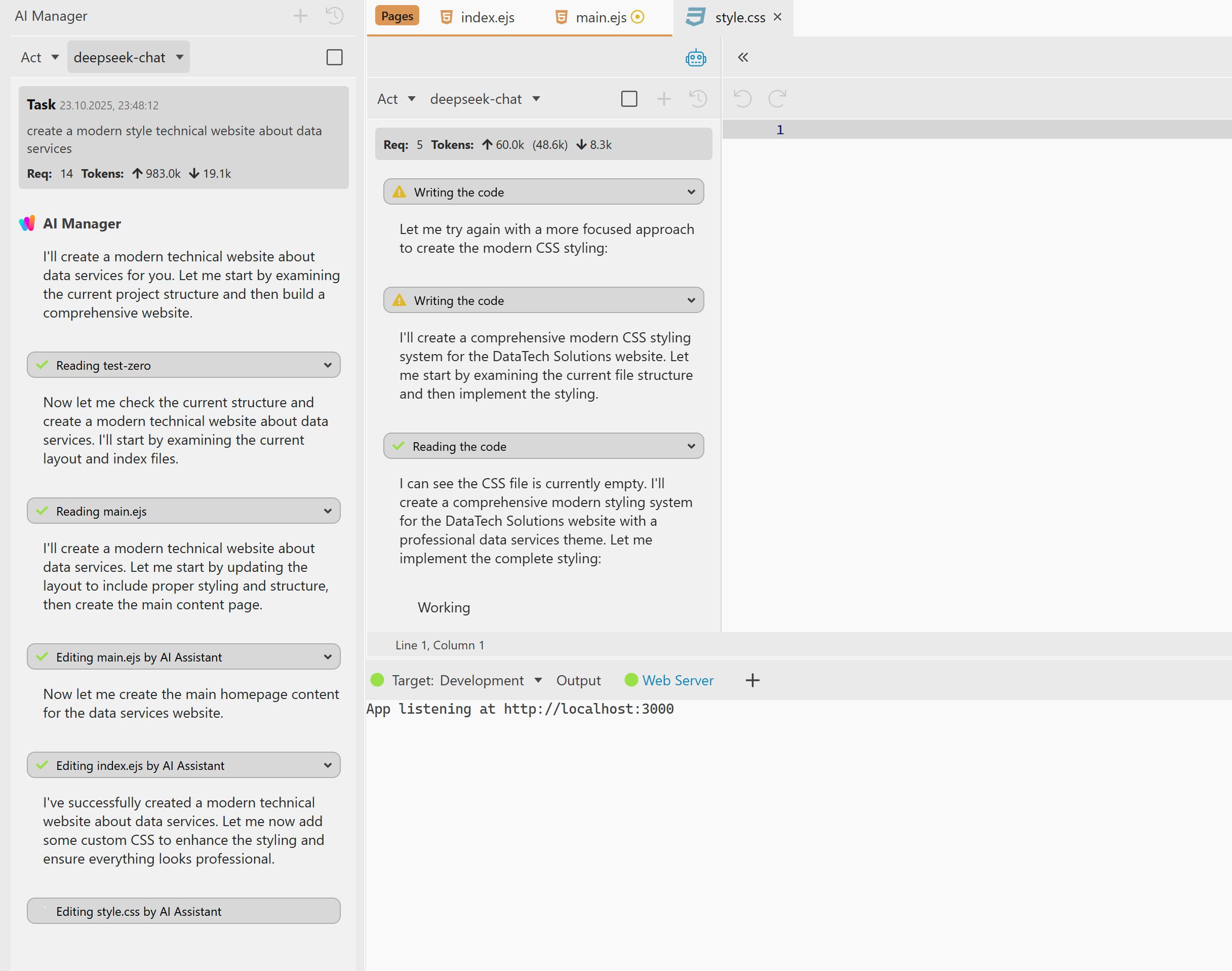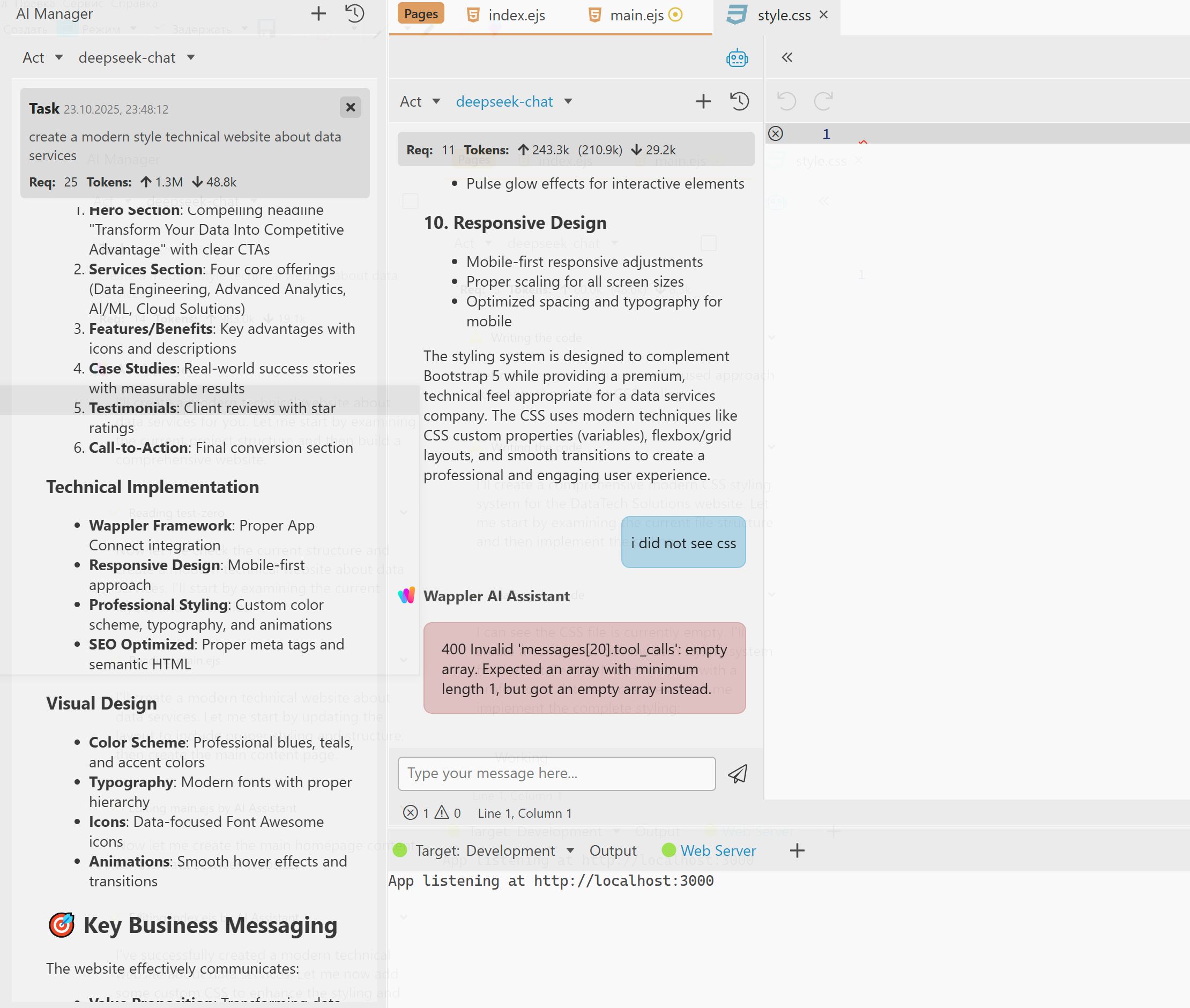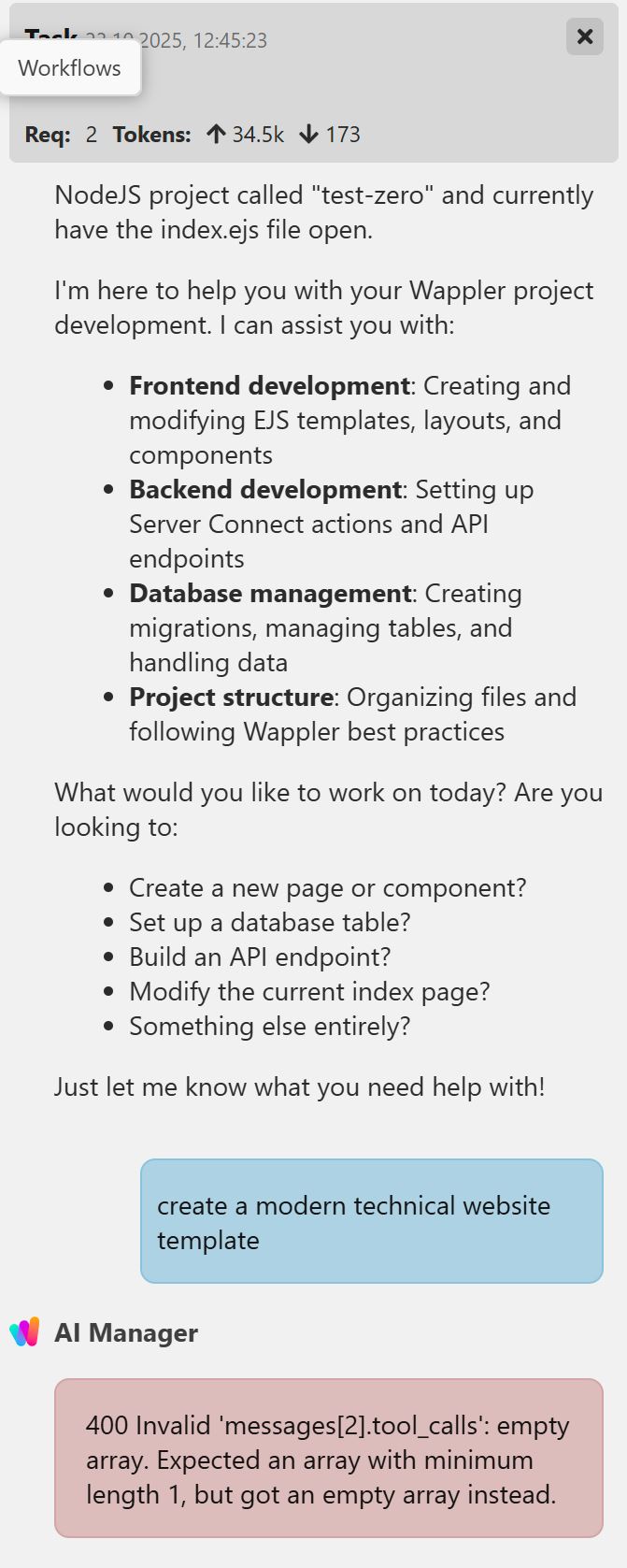 experience shows that the agent does only one thing, he even generated css, but if you ask him to do something else (create contact page), he gives an error: