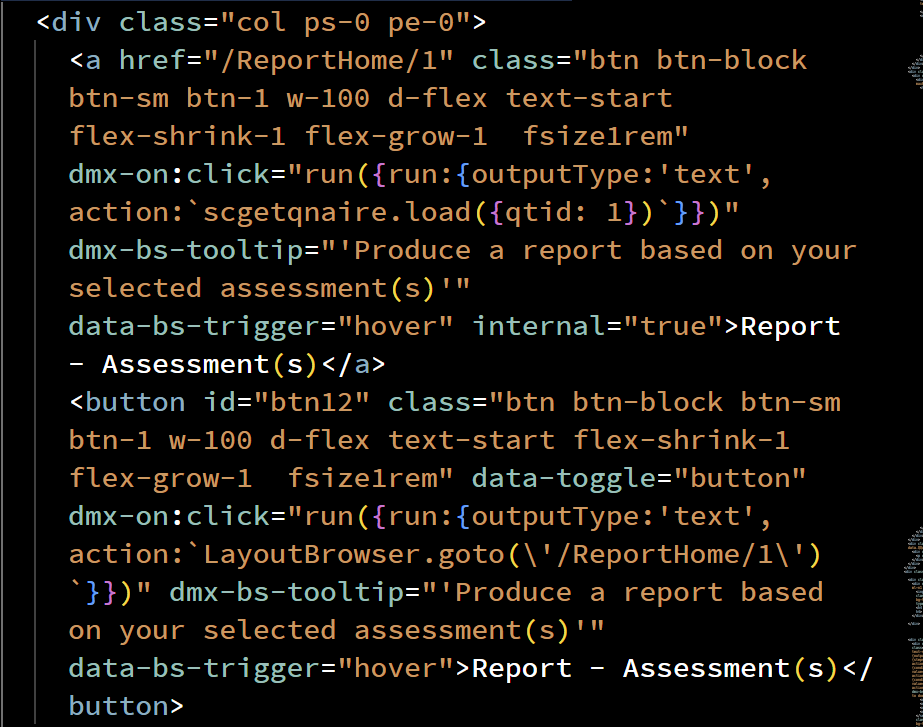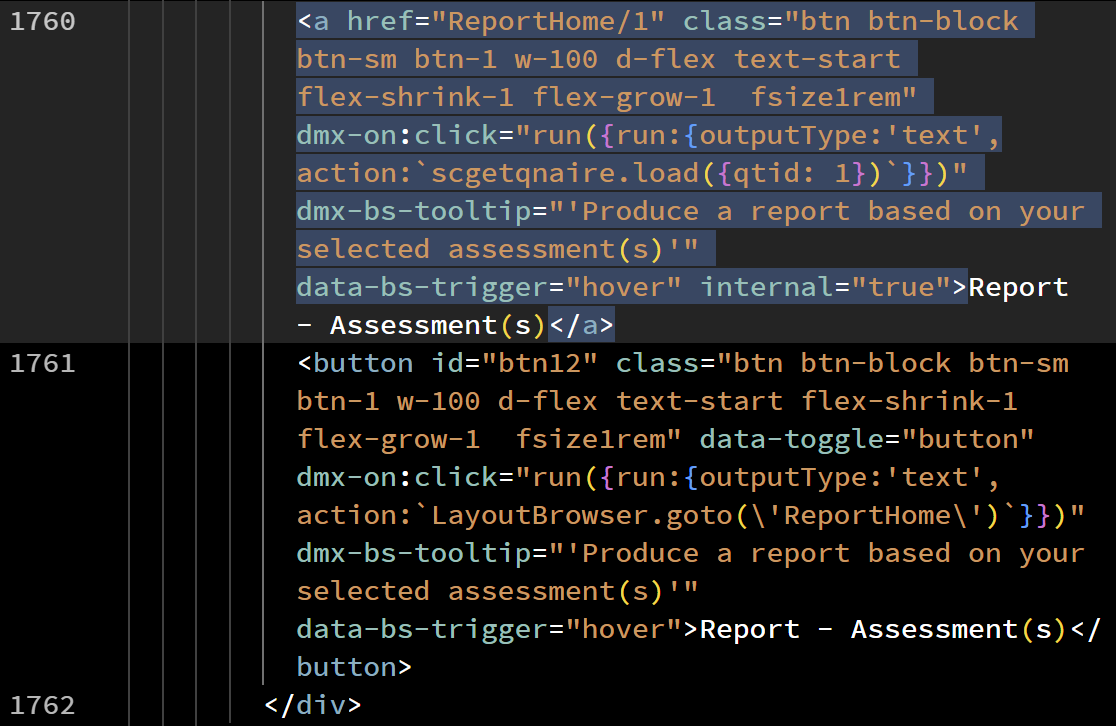 The code calling to route to ReportHome - note there are 2 buttons - the 2nd one is the original (although with the param removed for testing) and a browser goto, the top one i added as i thought the problem might be i needed a link rather than goto… but when with param neither work