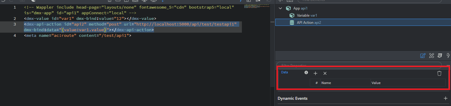 <dmx-api-action id="api2" method="post" url="http://localhost:5000/api/test/testapi1" dmx-bind:data="{value:`var1.value`}"></dmx-api-action>