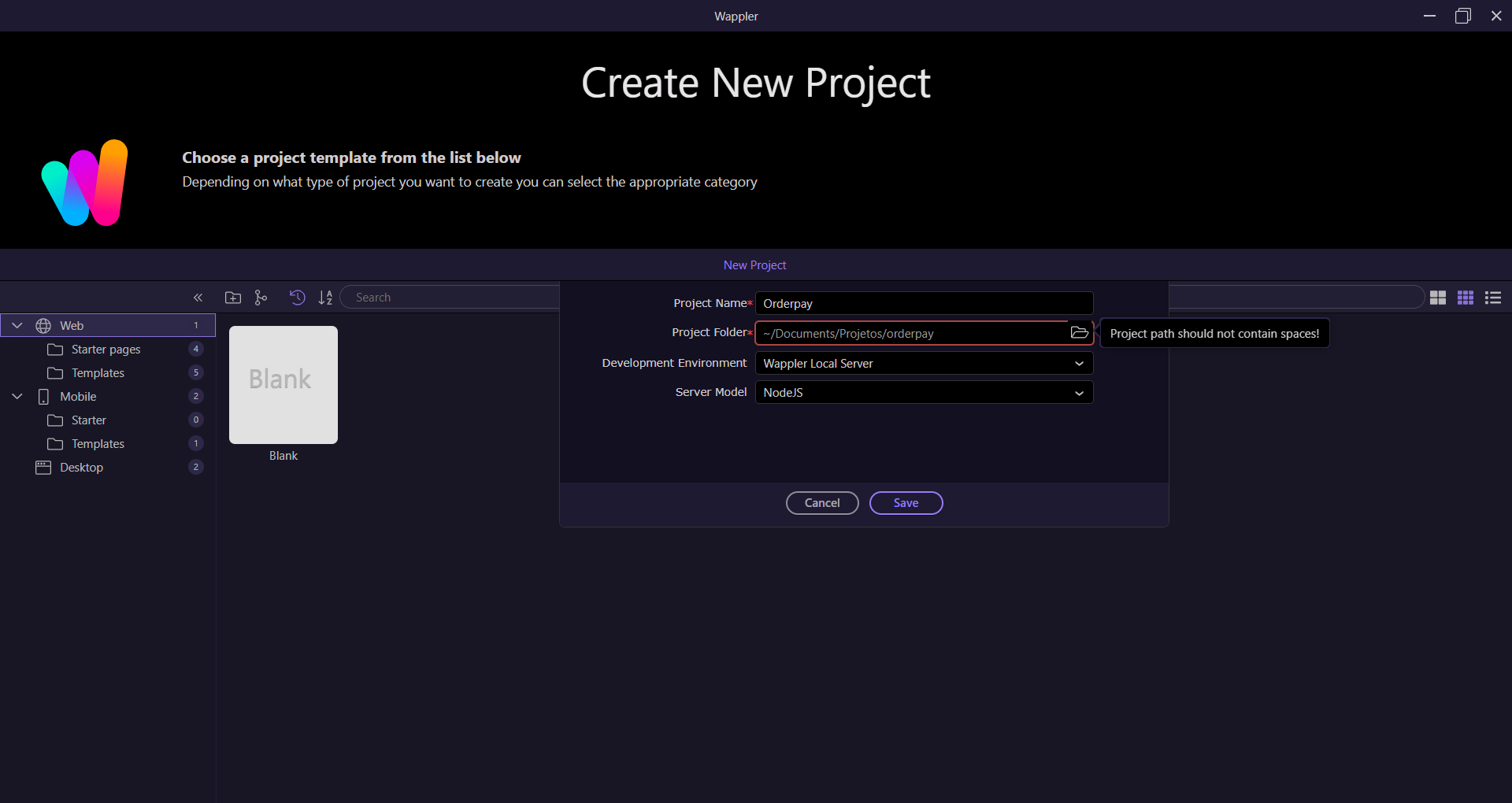 When trying to create a new project in Wappler, I receive the error message “Project path should not contain spaces!”, even though the specified directory does not contain any spaces.