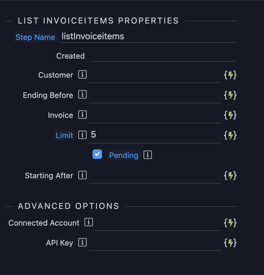 {“status”:“500”,“message”:“Action listInvoiceitems doesn’t exist in stripe”,“stack”:“Error: Action listInvoiceitems doesn’t exist in stripe\n at App._exec (/opt/node_app/lib/core/app.js:599:27)\n at App._exec (/opt/node_app/lib/core/app.js:576:28)\n at processTicksAndRejections (node:internal/process/task_queues:96:5)\n at async App.exec (/opt/node_app/lib/core/app.js:545:9)\n at async App.define (/opt/node_app/lib/core/app.js:527:9)”}