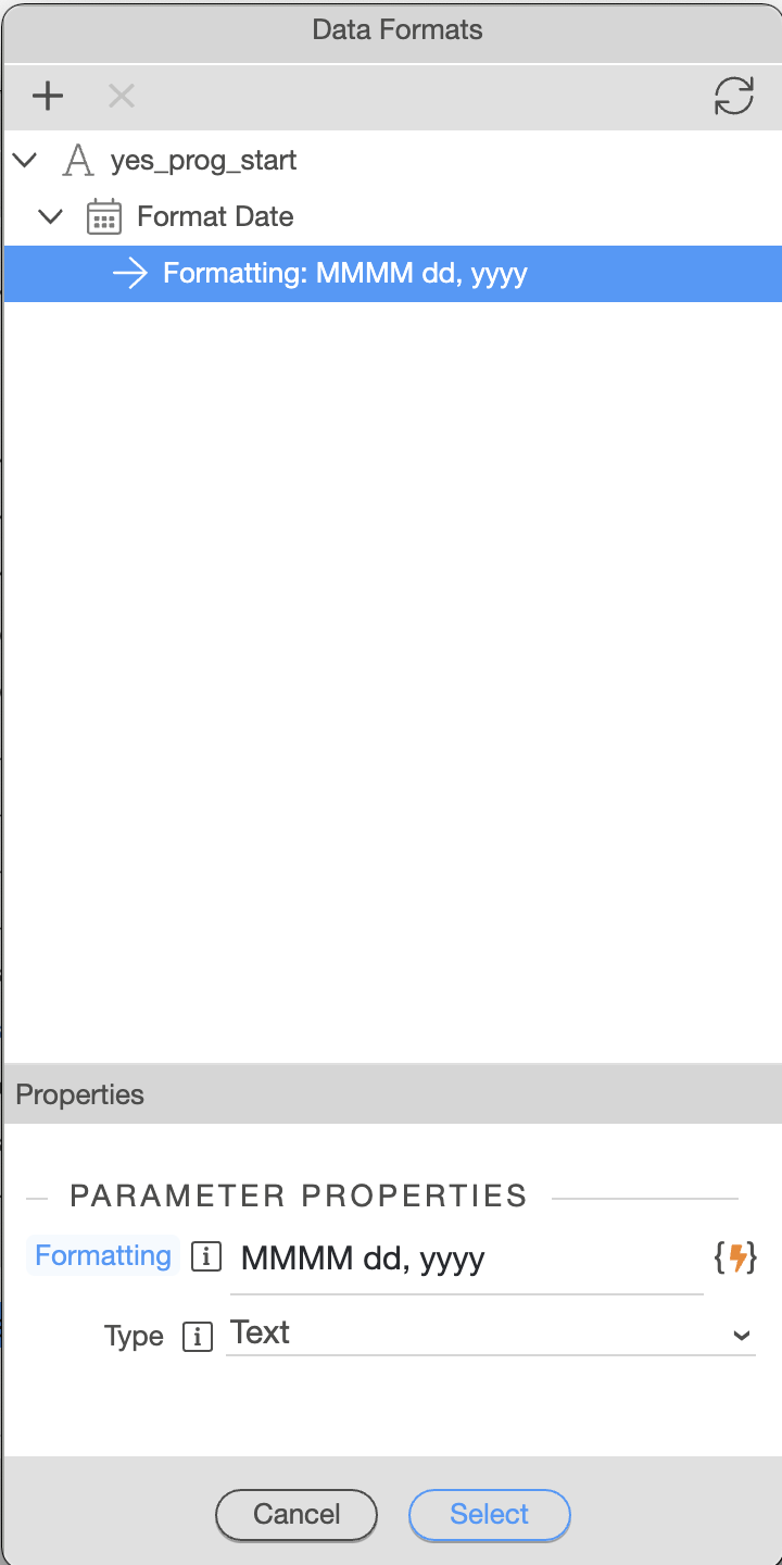 Hard to tell from your screenshot what is under it. It should say ‘Formatter’ and that’s where your format goes. Looks like you added a binding there instead.