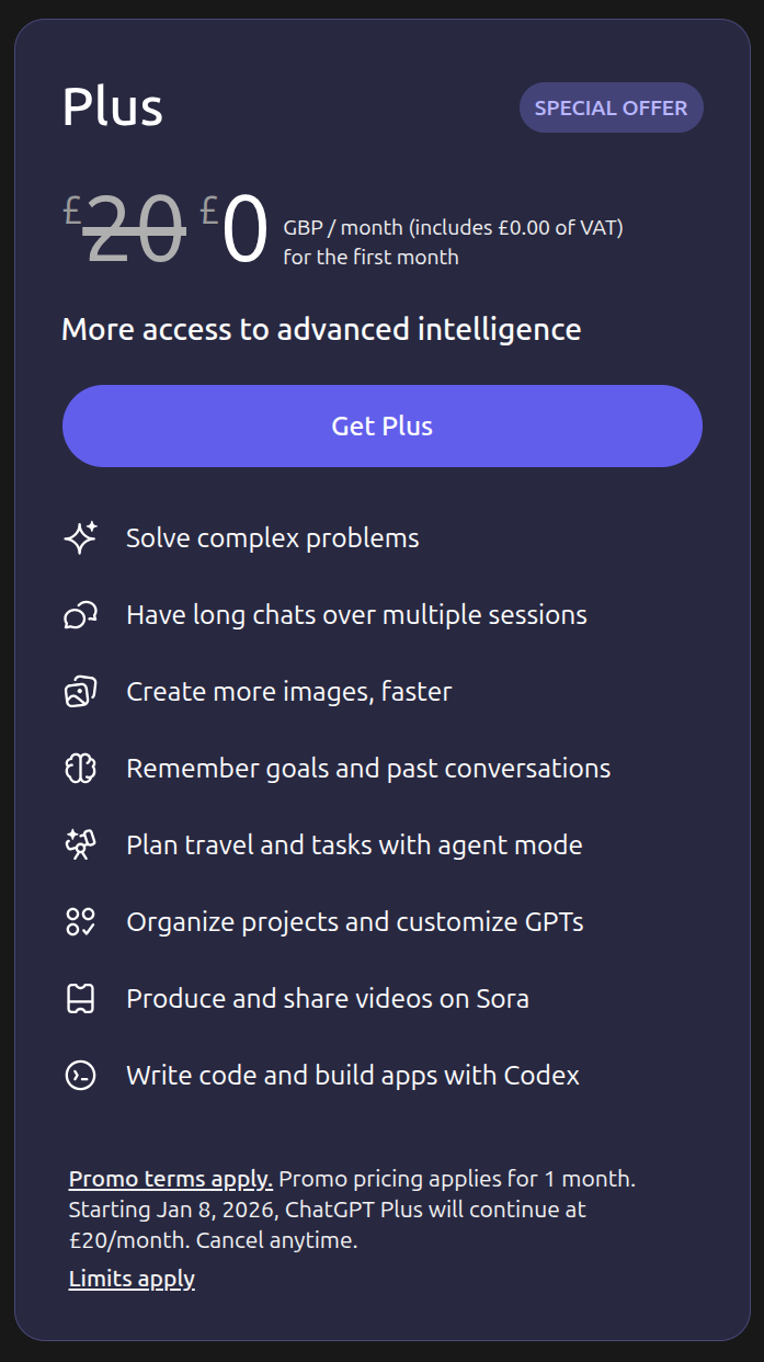 Open AI are having unsteady bowel movements since the launch of Gemini 3 and I just noticed that they are offering their Plus Plan FREE for a month... Now you'll probably have to enter a credit card number, no doubt, but just remove your payment method a day before its due (or if you can generate a virtual card in your banking application you can set its expiry to the day before)...