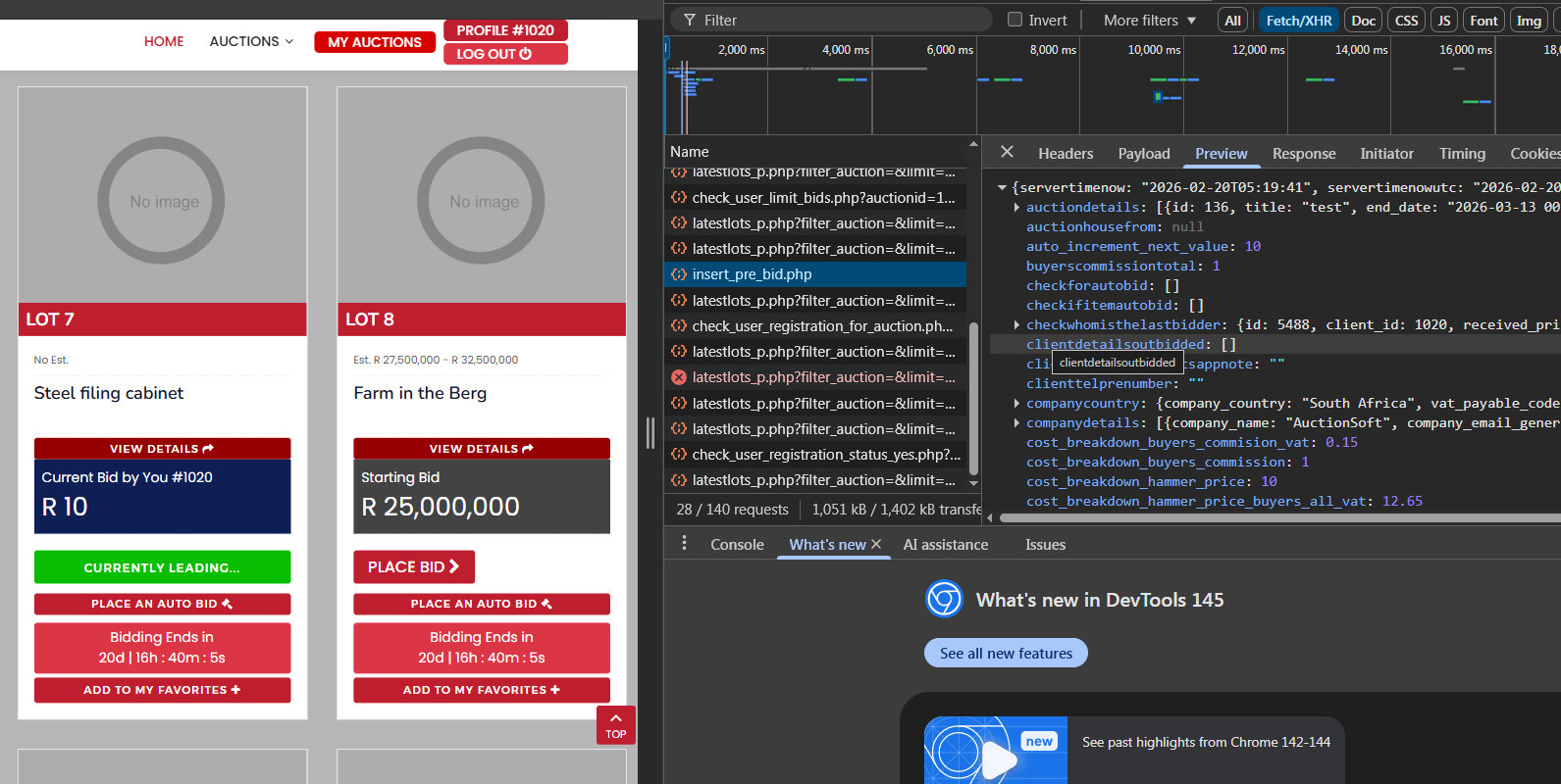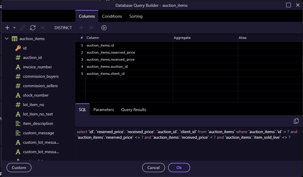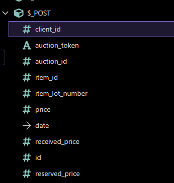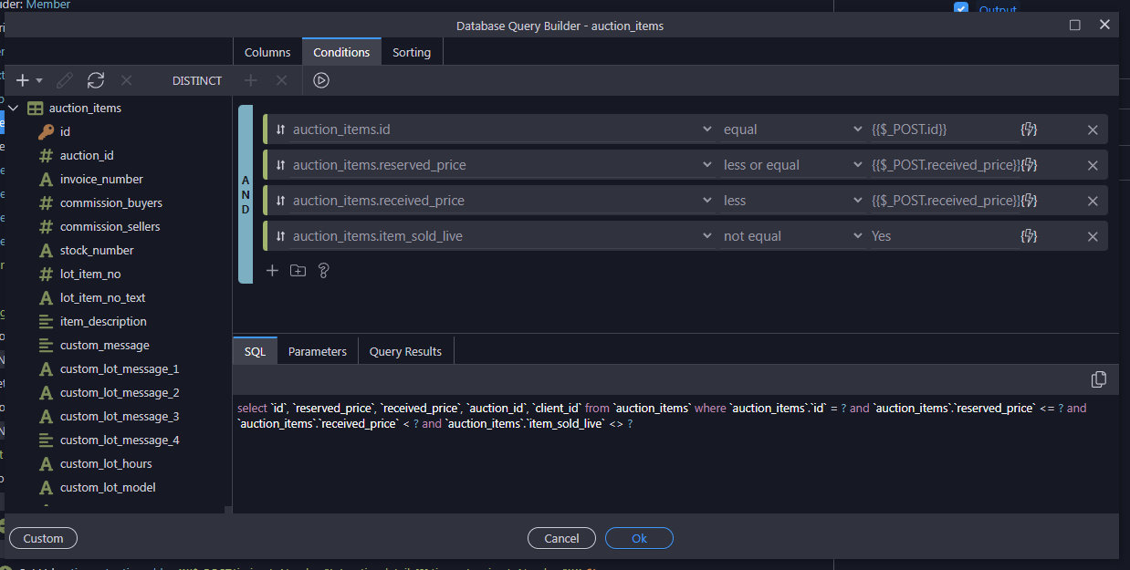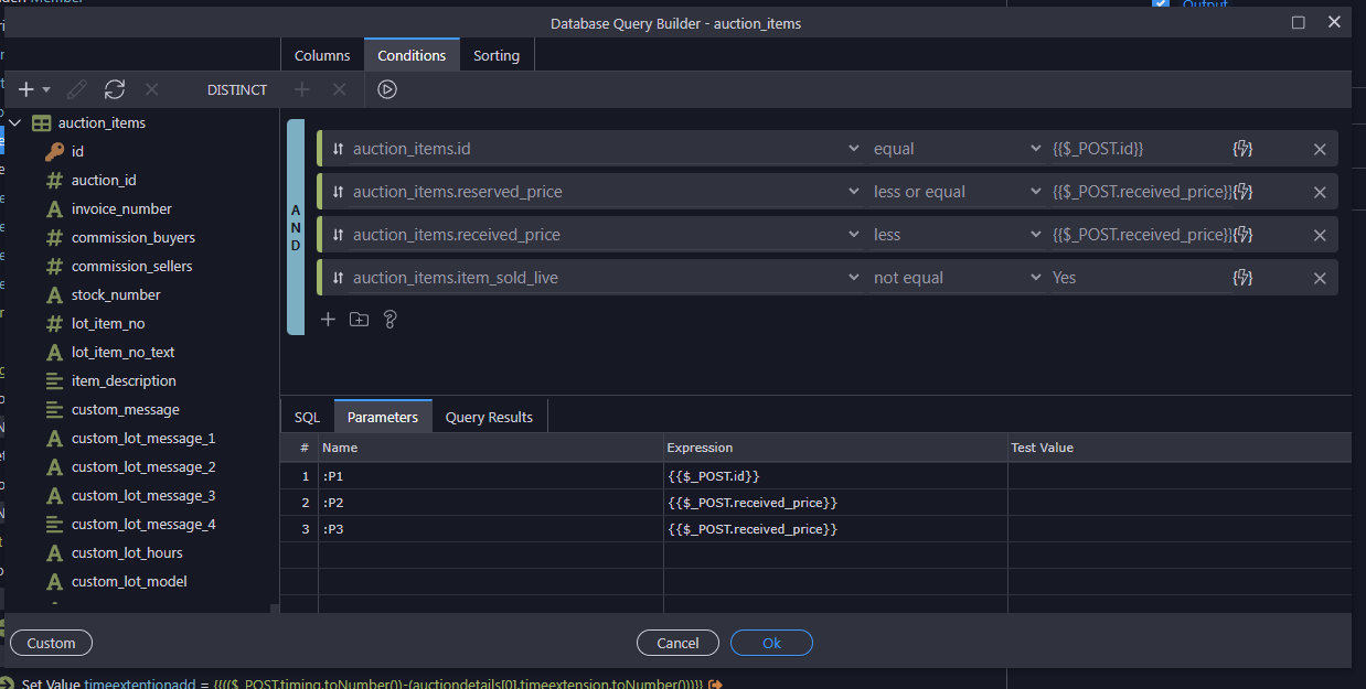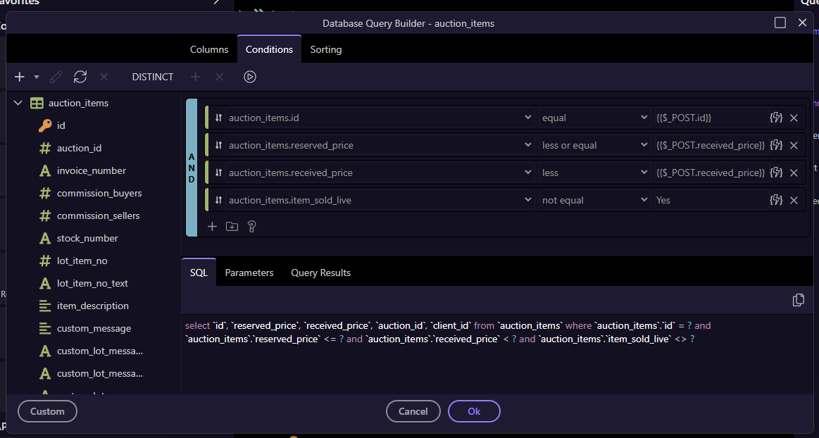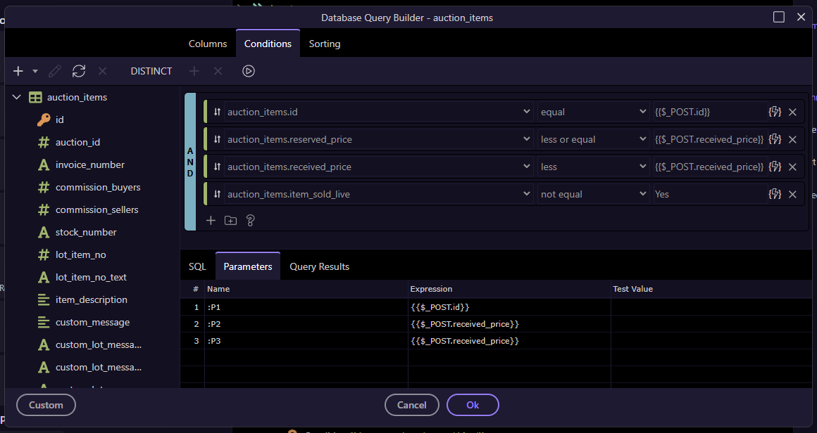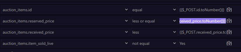 "query": "SELECT id, reserved_price, received_price, auction_id, client_id\nFROM auction_items\nWHERE id = :P1 /* {{$_POST.id}} */ AND reserved_price <= :P2 /* {{$_POST.received_price}} */ AND received_price < :P3 /* {{$_POST.received_price}} */ AND item_sold_live <> 'Yes'",