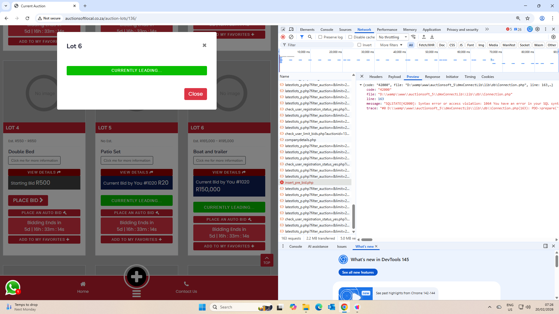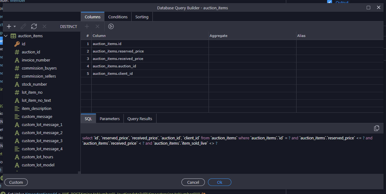 "SQLSTATE[42000]: Syntax error or access violation: 1064 You have an error in your SQL syntax; check the manual that corresponds to your MySQL server version for the right syntax to use near 'AND `reserved_price` <= ? AND `received_price` < ? AND `item_sold_live` <> ?)' at line 1"