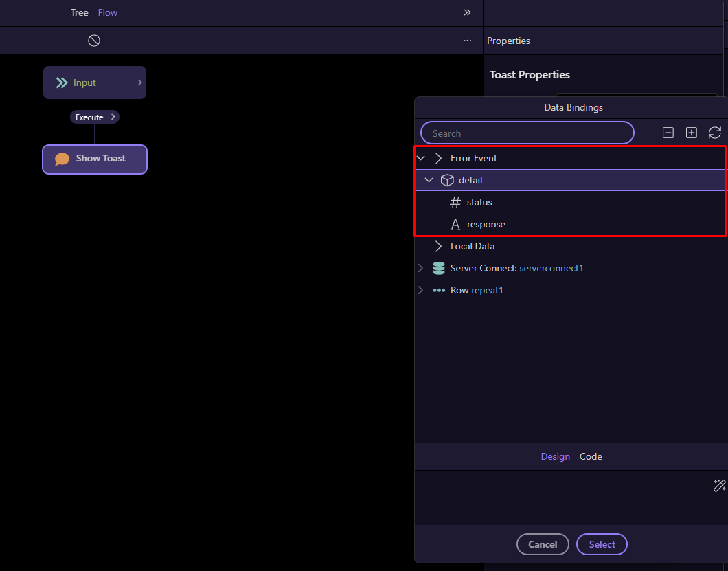 Now, whenever any Server Connect action on the page fails, the toast will appear automatically — no need to add separate on Error events to each Server Connect component.