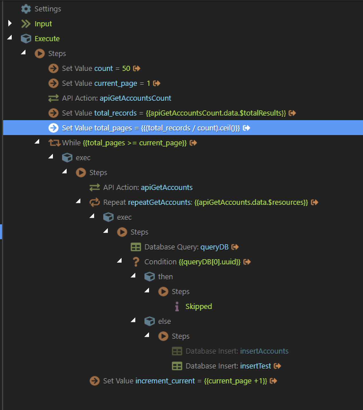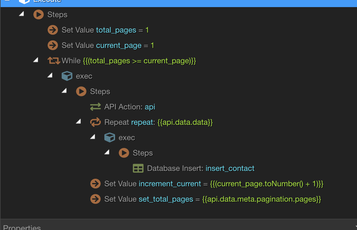 I then have a repeat and query the database to check if the ID exists in a table, if it does, it skips and if not inserts some of the info as a record.