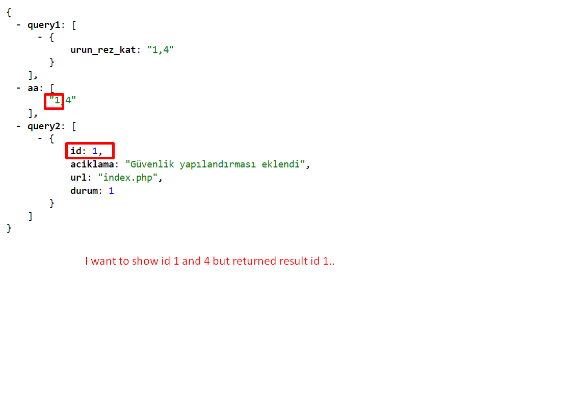 The problem {{query1[0].values(‘urun_rez_kat’)}} returns all results correctly … The second query (query 2) return only 1 result when I used it in query. if I use the IN or NOT IN