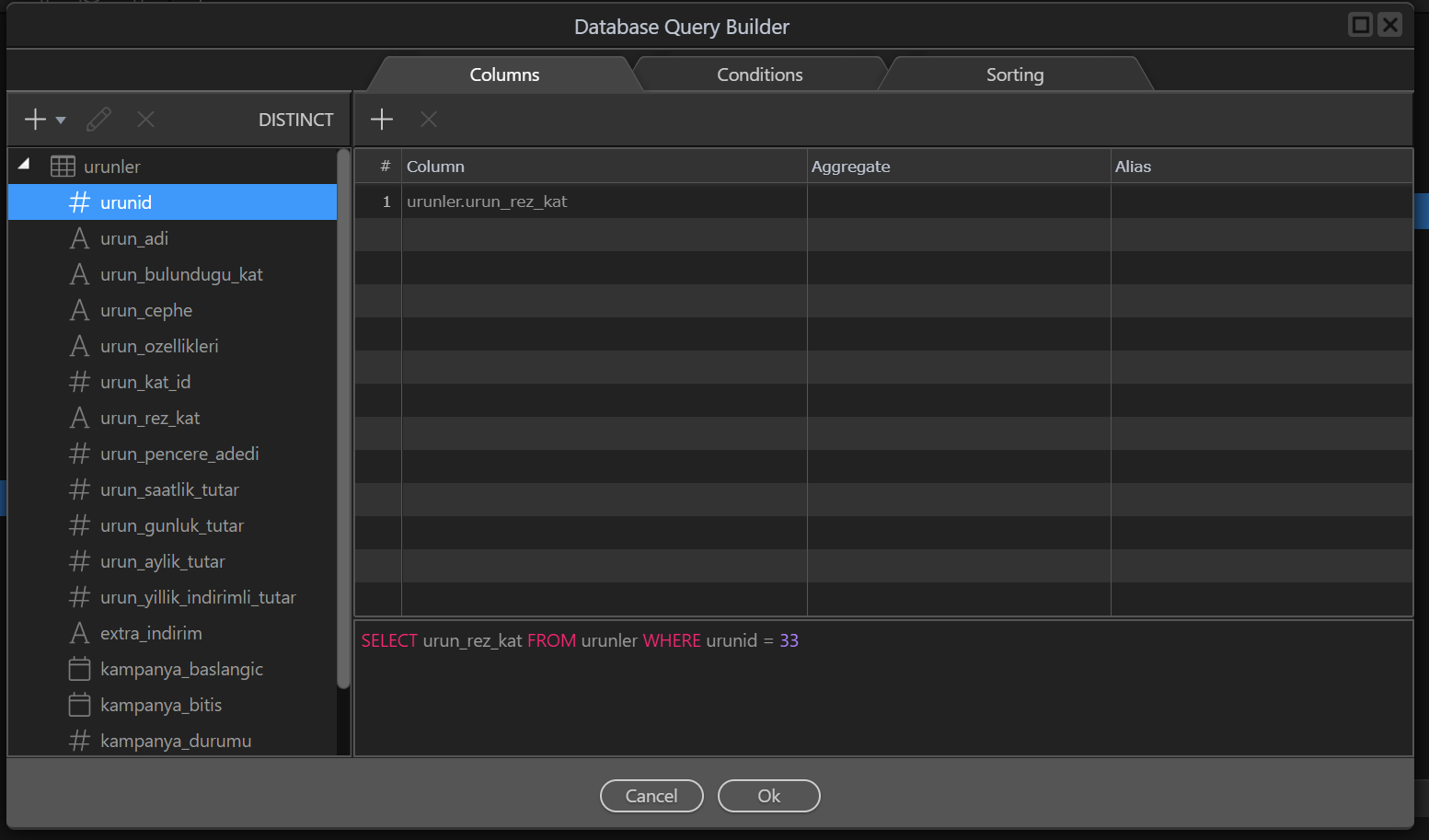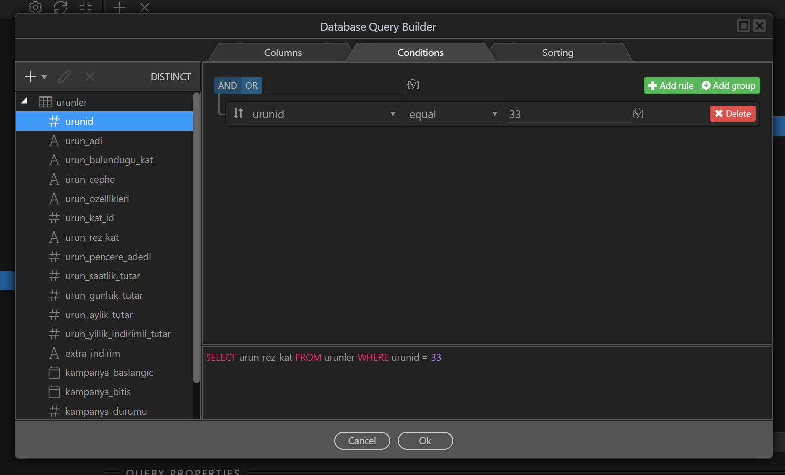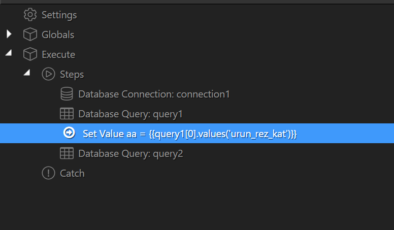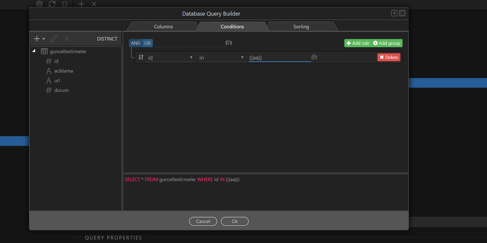 Your bb value is wrong, query2 is an array with objects, you can’t just use {{query2.urun_id}}. To get a single value from an array you use it like {{query2[0].urun_id}}, which will return the first id from the array. You want to use all the ids in the array as a parameter for the NOT IN condition for the next query, the condition requires an array as input. The problem is that the result from query2 is an array with objects in it, the conditions wants an array with only the ids in it. To get the values from the ids you use the values formatter, it flattens your array, use it like {{query2.values('urun_id')}}.