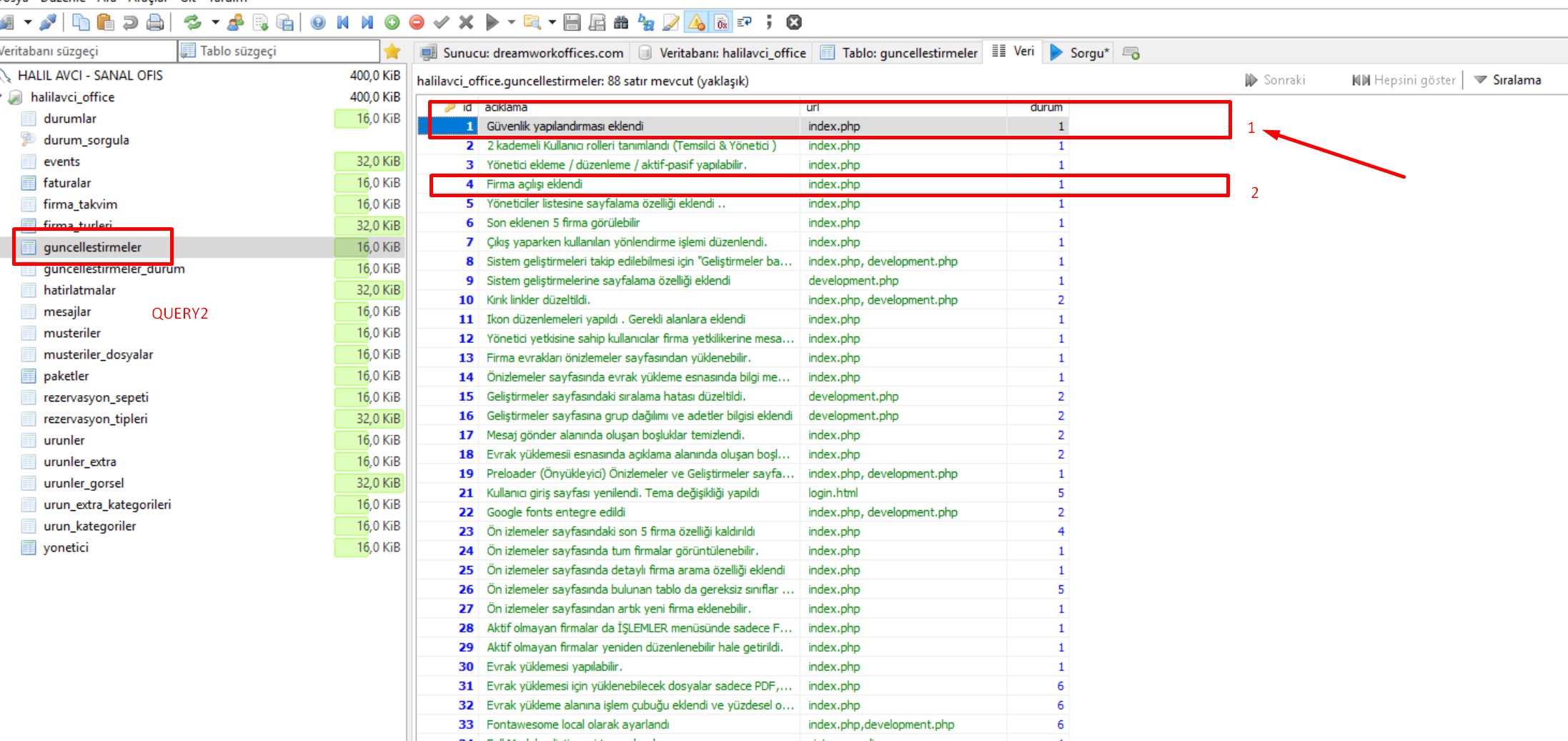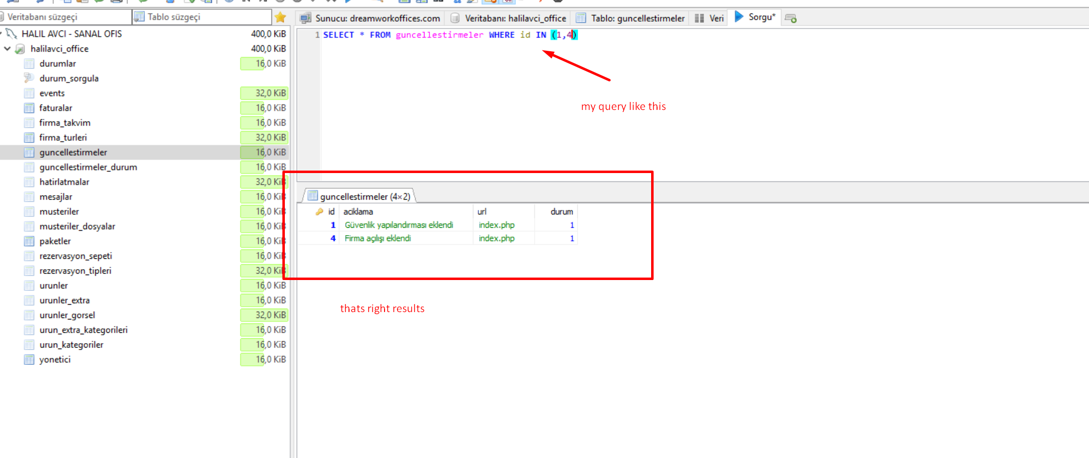 QUERY : select * from guncellestirmeler where id IN (1,4);
