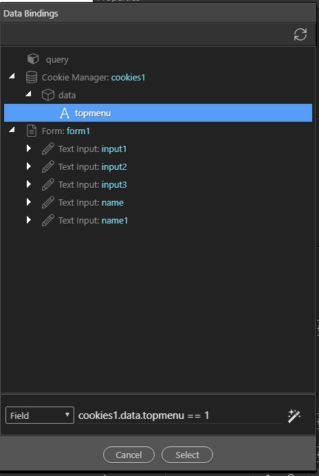 Now select your top menu, in dynamic attributes click > display > hide > when > select your cookie and add “== 1”: