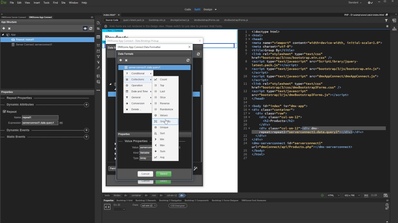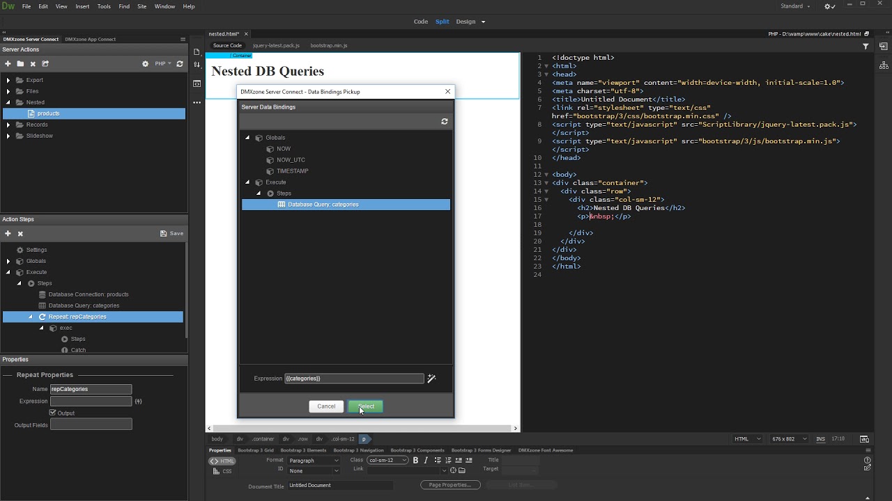 So the Company Name is like a Category and the Contacts are like Products. I just can’t get my head around how to set-up the Server Connect and the Repeat properties to get this result, can you throw some light on it?