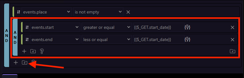 Simply use the group icon, to create a group with multiple conditions inside, where you can set the relations between them to AND or OR