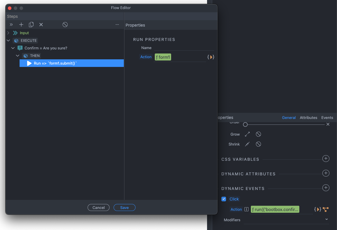 If needed, you can include a server action data source in the flow to get some dynamic data you want to display inside the confirm dialog.