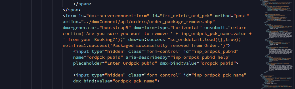 <form is="dmx-serverconnect-form" id="frm_delete_ord_pck" method="post" action="../dmxConnect/api/orders/order_package_remove.php" dmx-generator="bootstrap5" dmx-form-type="horizontal" onsubmit="return confirm('Are you sure you want to remove ' + dmx.parse('var_ordpck_pck_name.value') + ' from your Booking?');" dmx-on:success="sc_orddetail.load({},true);notifies1.success('Packaged successfully removed from Order.')">