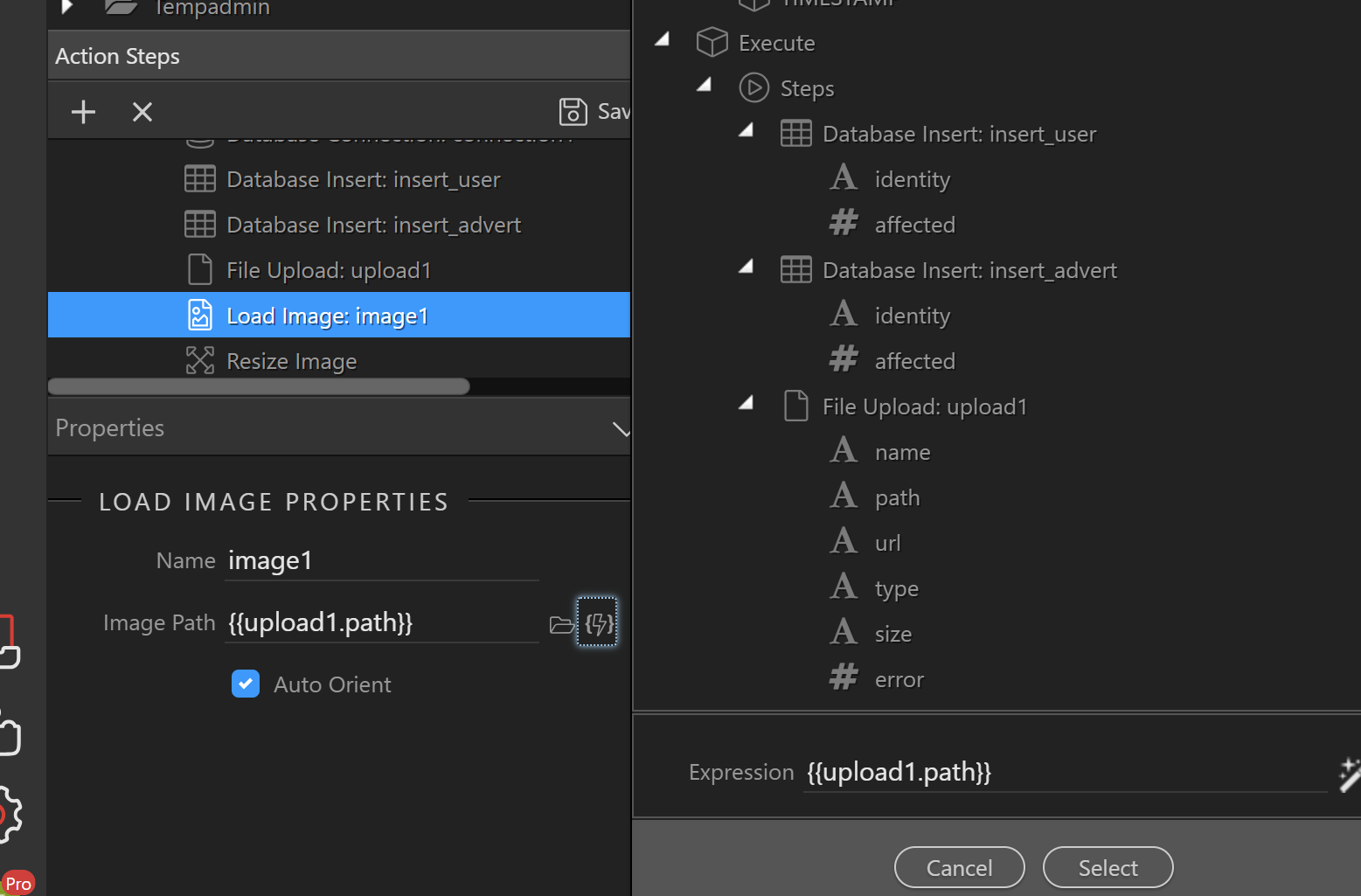 I used already all the tutorials, used all kind of File Upload Steps with Overwrite, Path, replace etc etc, used new LoadFile with all variants of Path settings with slash, backslash, escaping, etc etc. But fileupload works… it gives me still that annoying bug… also checked if maybe Insert Fileupload Action is loaded to early… but its not.