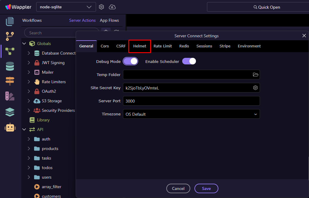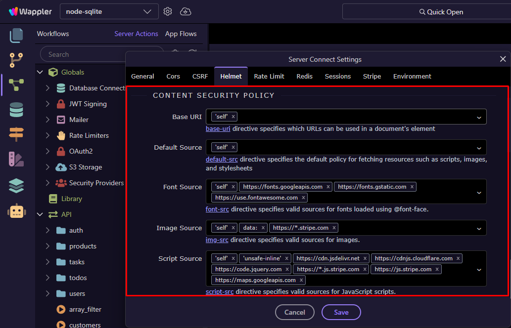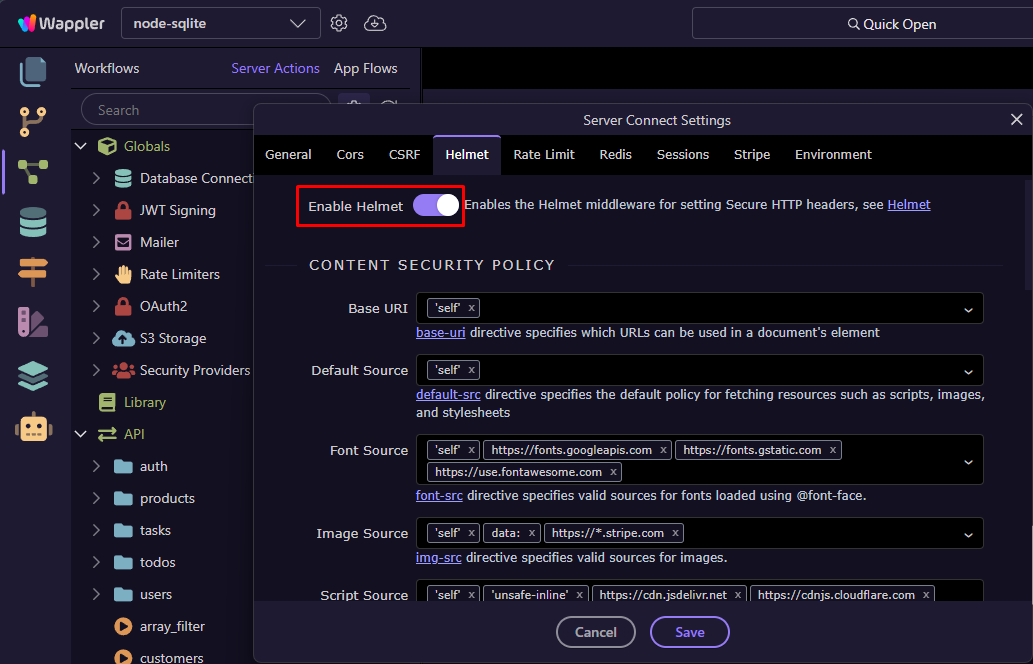 Wappler now makes it easy to configure HTTP Security Headers in your Node.js projects through the built-in Helmet middleware.