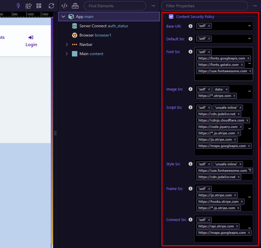 To configure, in App Structure select App β Meta Tags β Content Security Policy in the App Structure panel. For Node.js, this should be applied on the Layout (main) pages: