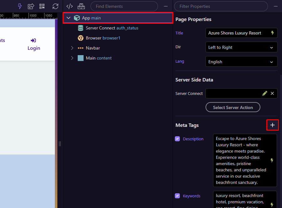 you can define them directly using Meta Tags in the App Structure panel.