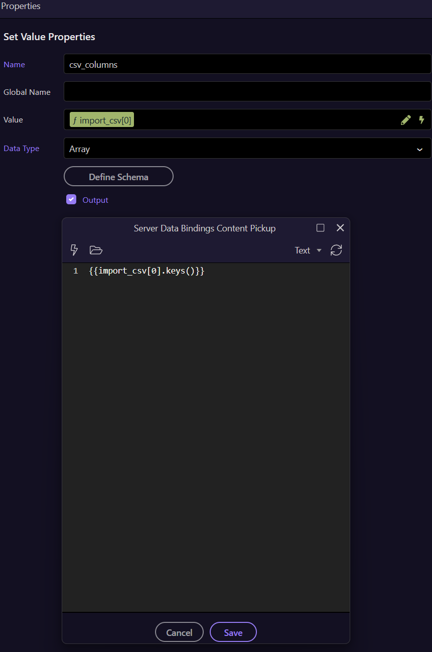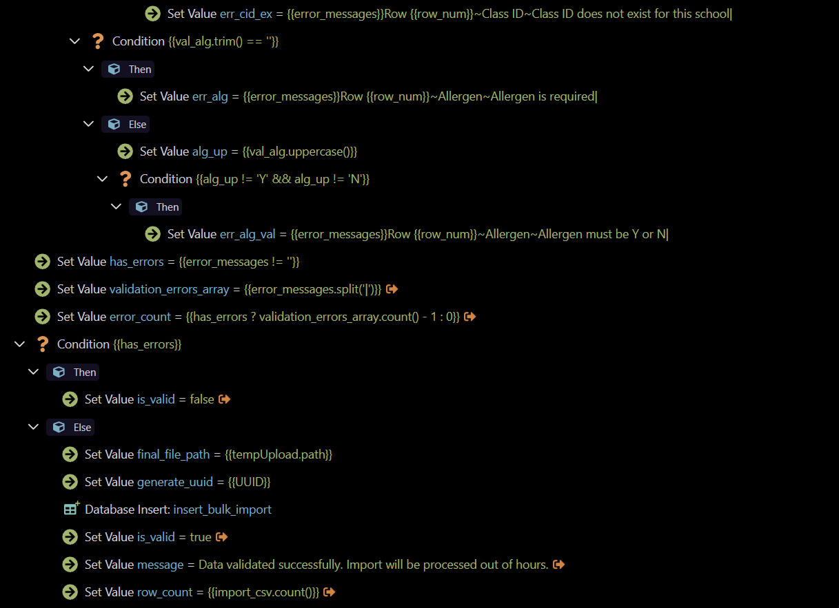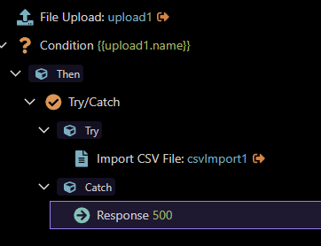 All i want is.. if the CSV file does not match the “elements” for the import.. then it should not give me the error of what is below (*even if its the correct error, and its good to know why) .. but if the Import CSV File is within a TRY/CATCH… then it must take the error into account.. but then the CATCH must give me a response… i guess….