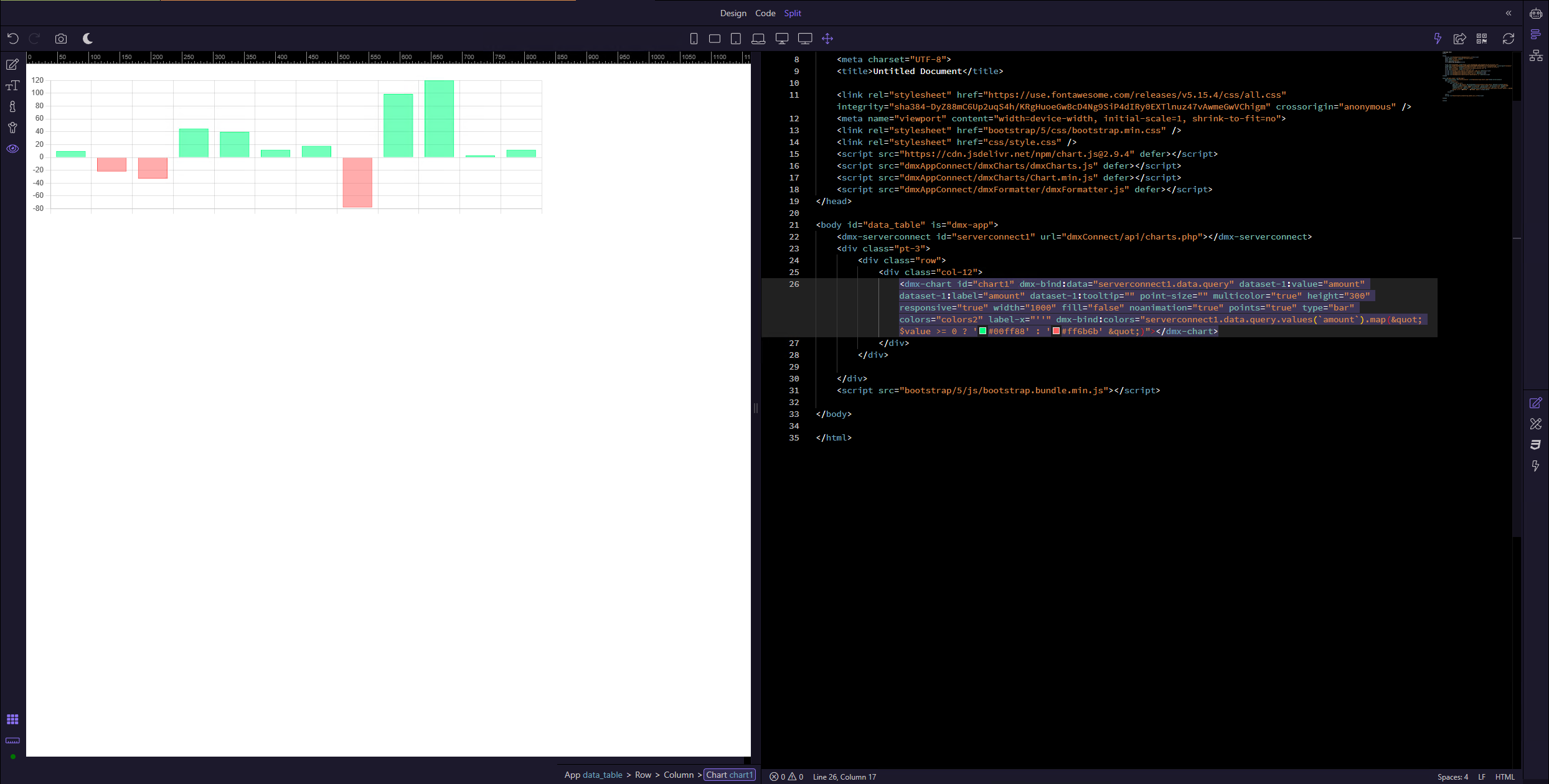 <dmx-chart id="chart1" responsive="true" dmx-bind:data="chart_netpnl.data.query" dataset-1:label="profit" dataset-1:value="Profit" point-size="" type="bar" label-x="''" dmx-bind:colors="chart_netpnl.data.query.values(`Profit`).map(" $value>= 0 ? '#1aa042' : '#d83148' ")"></dmx-chart>