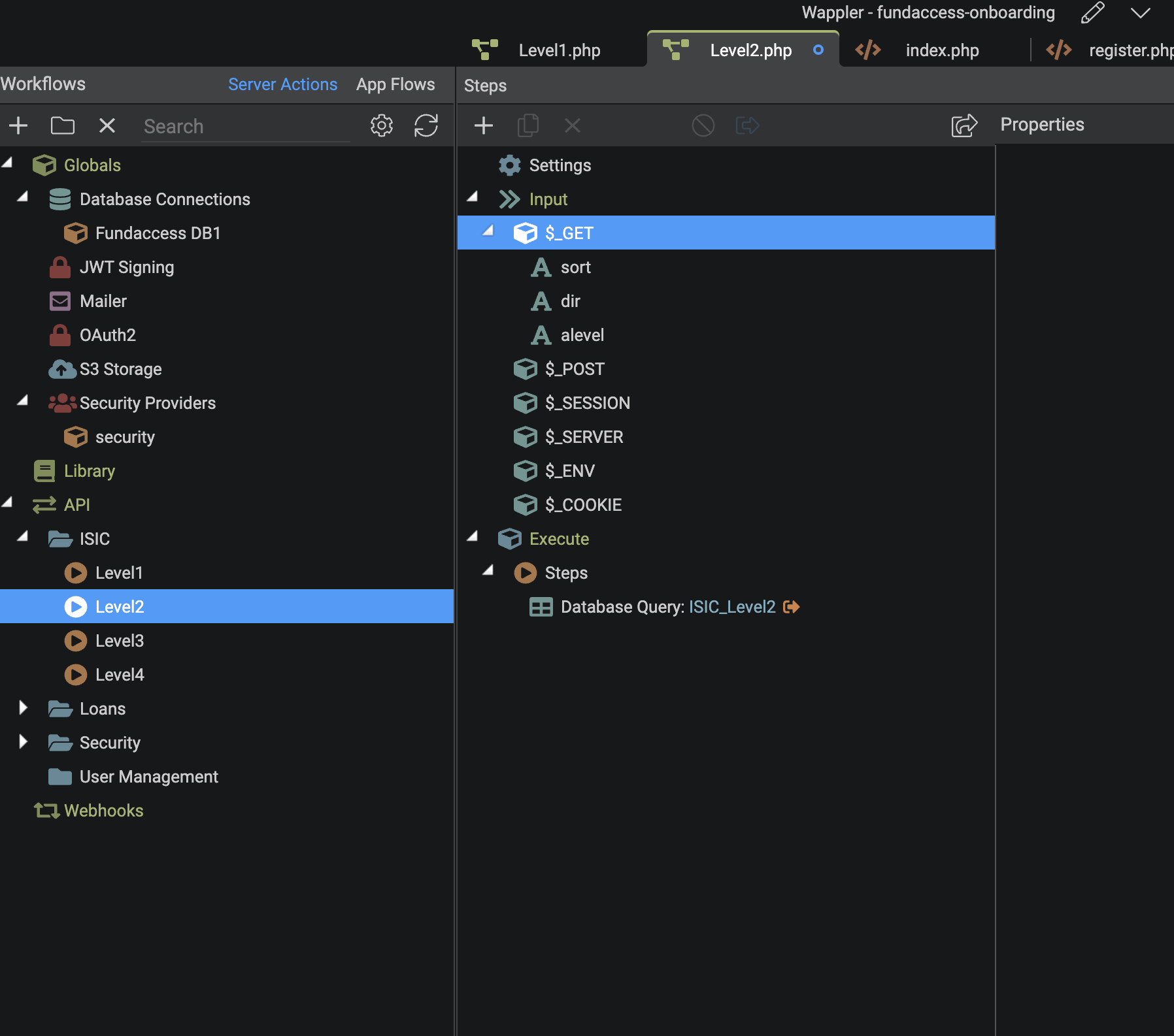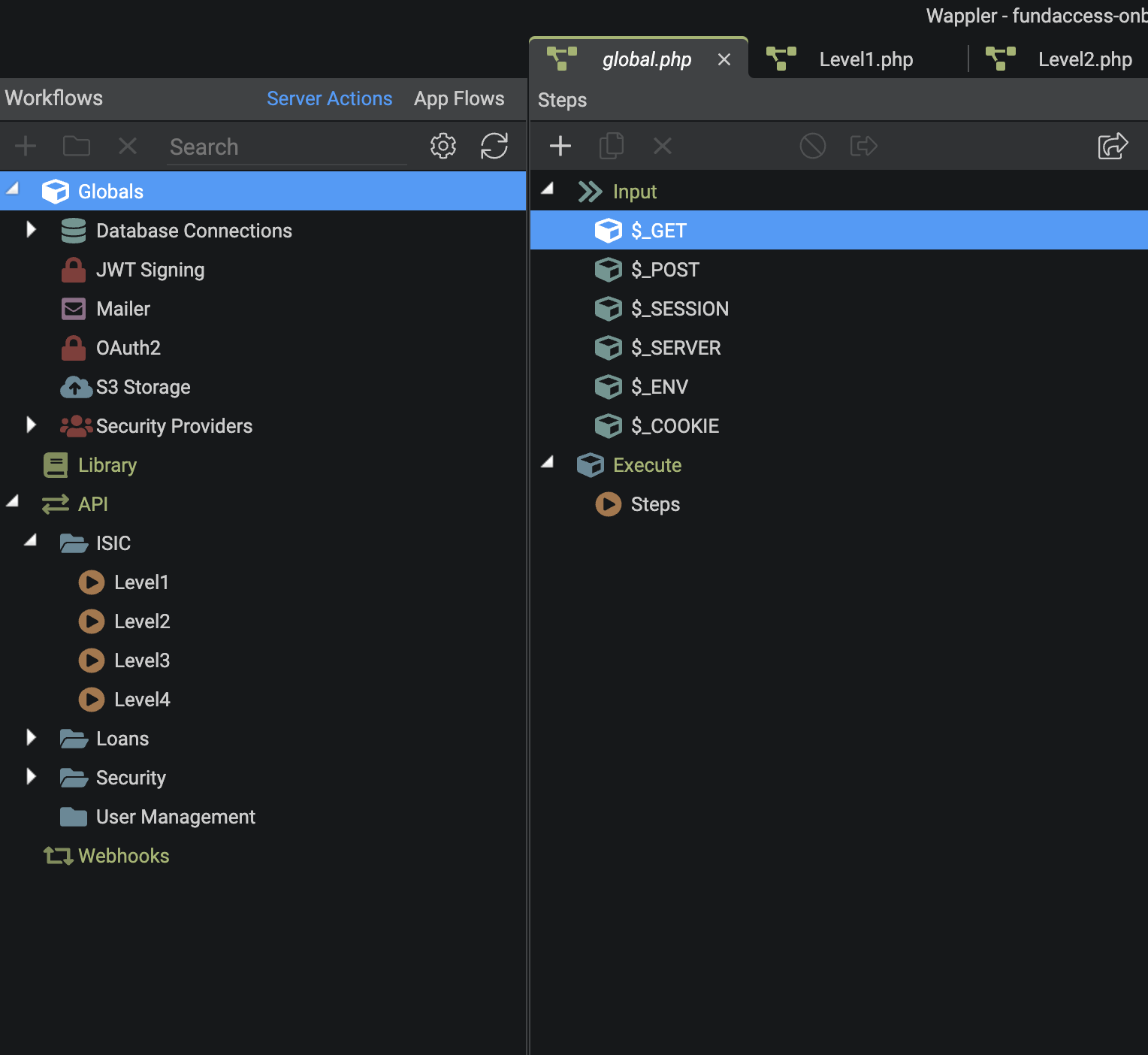 Well thats looking ok so far, can you send a screenshot of the Level2.php steps as well as the Global $_GET and $_POST