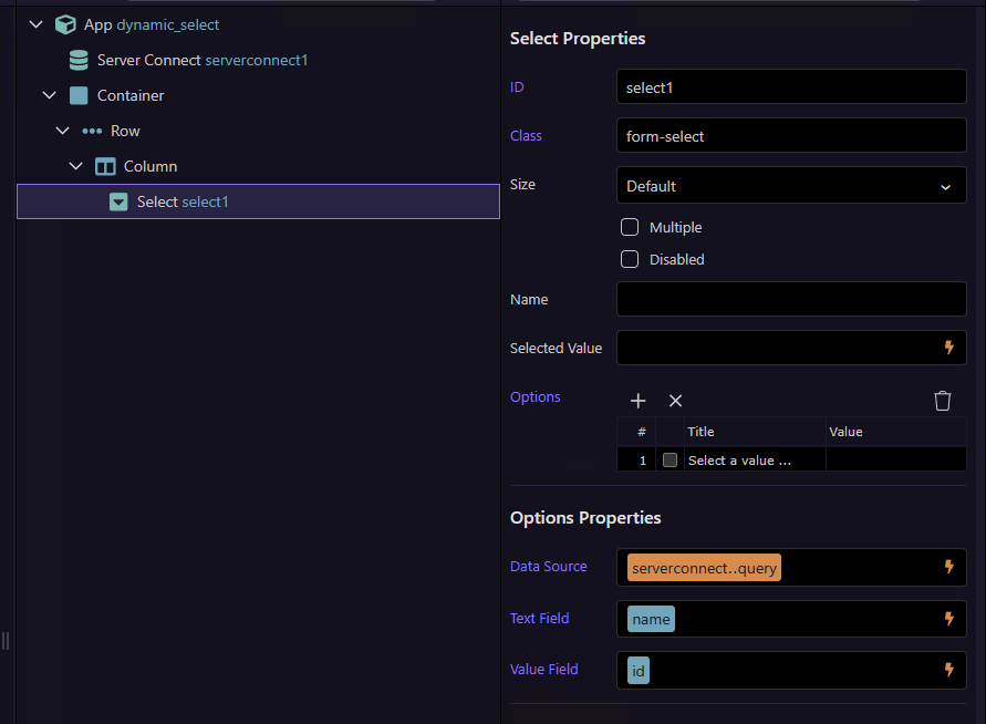 <select id="select1" class="form-select" dmx-bind:options="serverconnect1.data.query" optiontext="name" optionvalue="id">