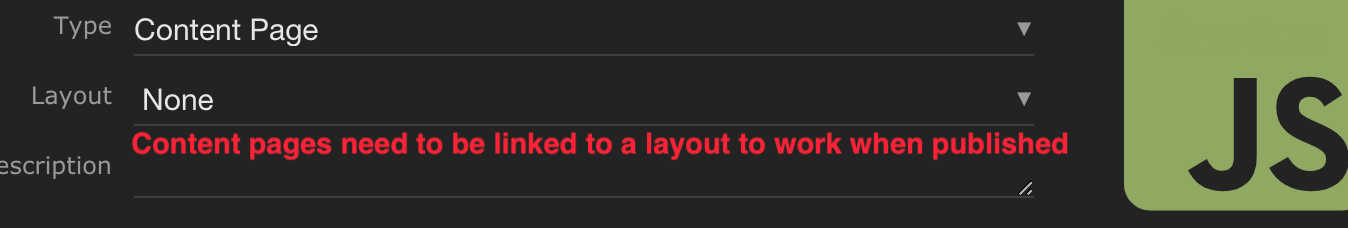 Alternatively, if you don’t like adding a blank layout page to a project, have a warning secondary text message when ‘None’ is selected saying something like ‘Content pages need to be linked to a layout to work when published’: