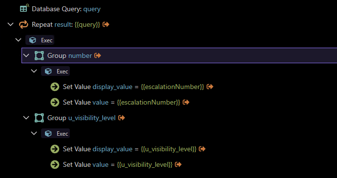 Repeat the query, then add a group for each of the properties you need (eg. number, u_visibility_level etc) . Inside each group add two set value steps display_value and value and bind the data from the repeat: