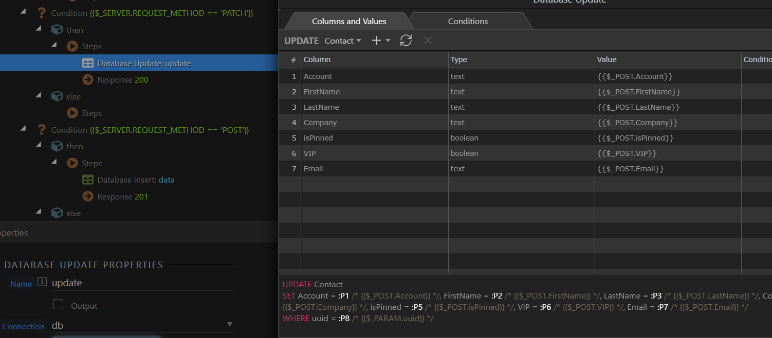 "message": "Empty .update() call detected! Update data does not contain any values to update. This will result in a faulty query. Table: Contact. Columns: Account,FirstName,LastName,Company,isPinned,VIP,Email.",