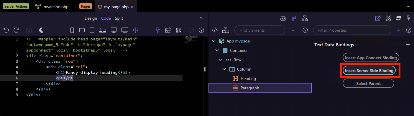 Then in code view place the cursor where you want the srever-side data and click the Server Side Binding button: