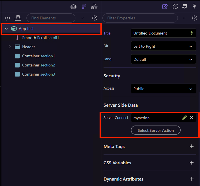 You can select a server action on the Layout or on the Content page (or on the Full Page also):