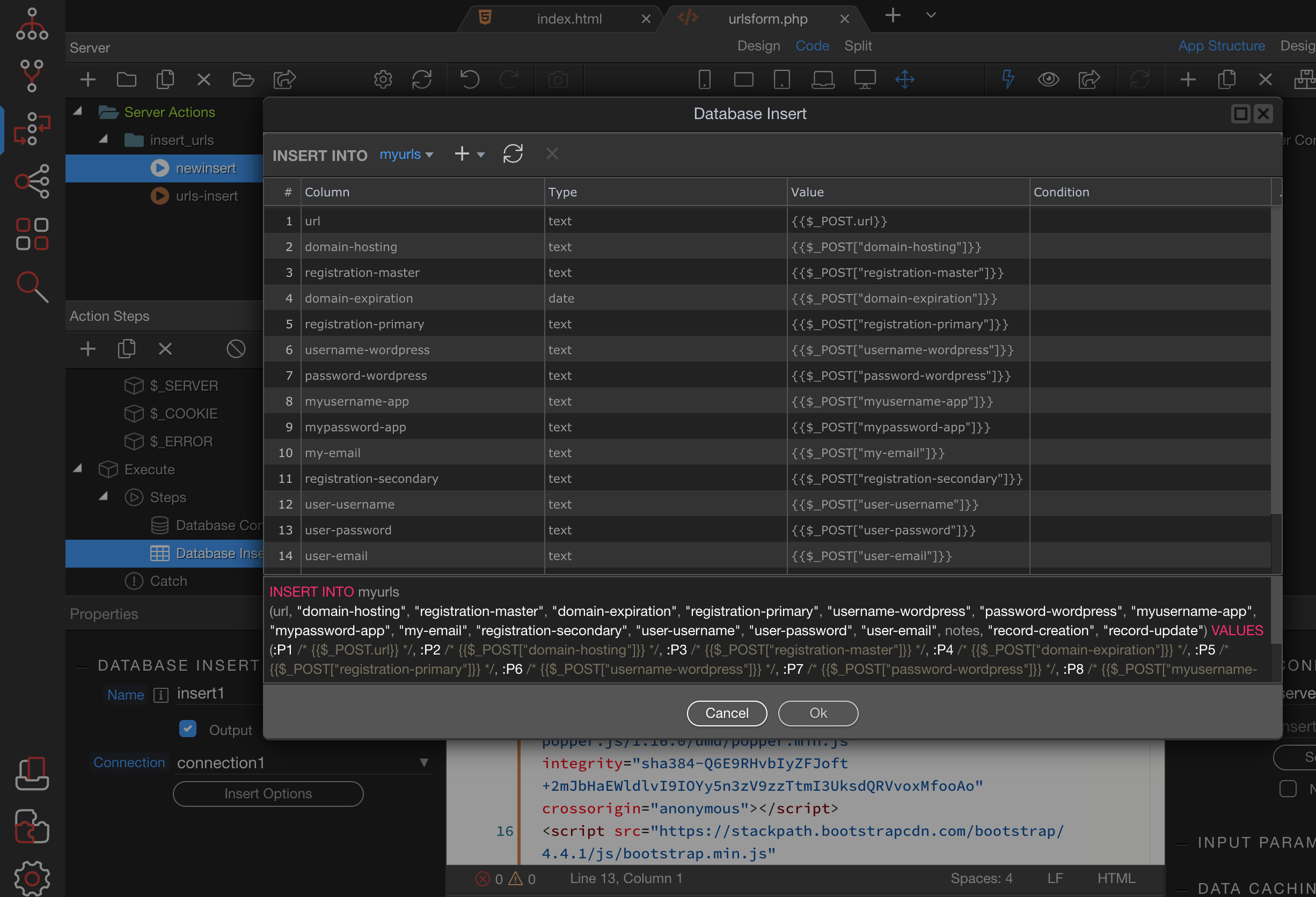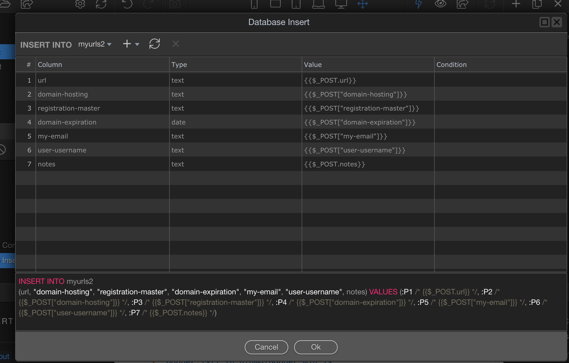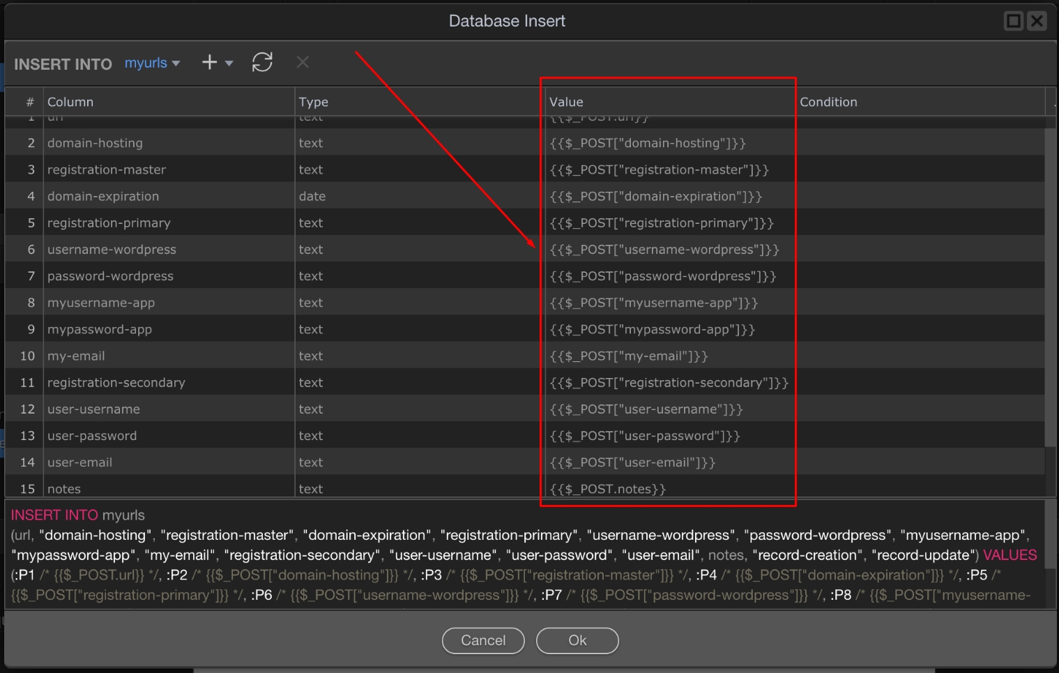"query": "INSERT INTO myurls\n(url, \"domain-hosting\", \"registration-master\", \"domain-expiration\", \"registration-primary\", \"username-wordpress\", \"password-wordpress\", \"myusername-app\", \"mypassword-app\", \"my-email\", \"registration-secondary\", \"user-username\", \"user-password\", \"user-email\", notes, \"record-creation\", \"record-update\") VALUES (:P1 /* {{$_POST.url}} */, :P2 /* {{$_POST[\"domain-hosting\"]}} */, :P3 /* {{$_POST[\"registration-master\"]}} */, :P4 /* {{$_POST[\"domain-expiration\"]}} */, :P5 /* {{$_POST[\"registration-primary\"]}} */, :P6 /* {{$_POST[\"username-wordpress\"]}} */, :P7 /* {{$_POST[\"password-wordpress\"]}} */, :P8 /* {{$_POST[\"myusername-app\"]}} */, :P9 /* {{$_POST[\"mypassword-app\"]}} */, :P10 /* {{$_POST[\"my-email\"]}} */, :P11 /* {{$_POST[\"registration-secondary\"]}} */, :P12 /* {{$_POST[\"user-username\"]}} */, :P13 /* {{$_POST[\"user-password\"]}} */, :P14 /* {{$_POST[\"user-email\"]}} */, :P15 /* {{$_POST.notes}} */, :P16 /* {{$_POST[\"record-creation\"]}} */, :P17 /* {{$_POST[\"record-update\"]}} */)",