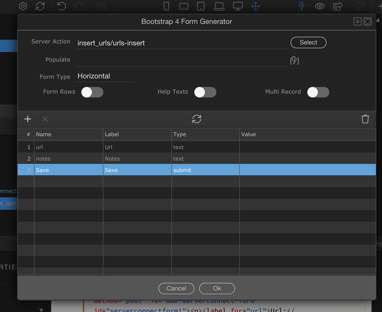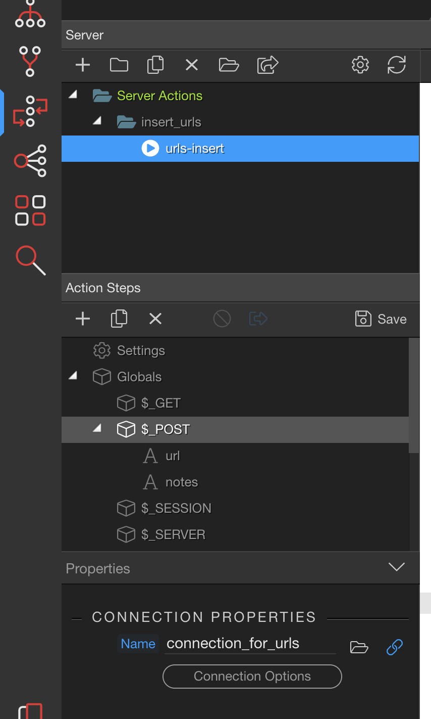 In the right side App Structure panel I create a server connect and select the server action I created for this form.