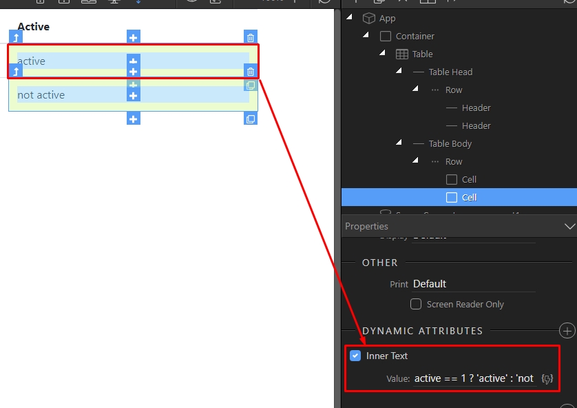 Currently you could just generate your table, then select the field showing the division_active and use the formatter in the inner-text property: