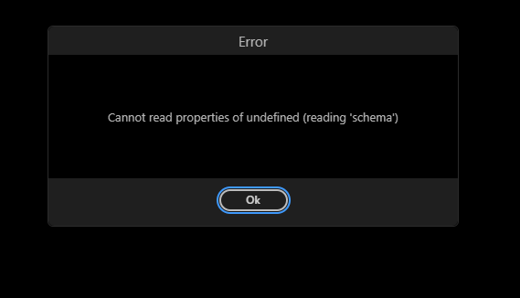 When I click on the query builder, it returns the following error message: Cannot read properties of undefined (reading 'schema').
