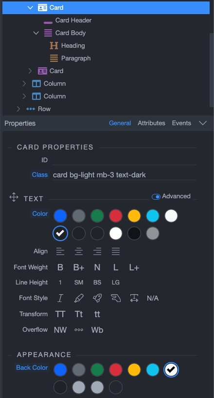 It all comes from classes applied to the card. For example this is the “light” card. It uses the light background and dark text: