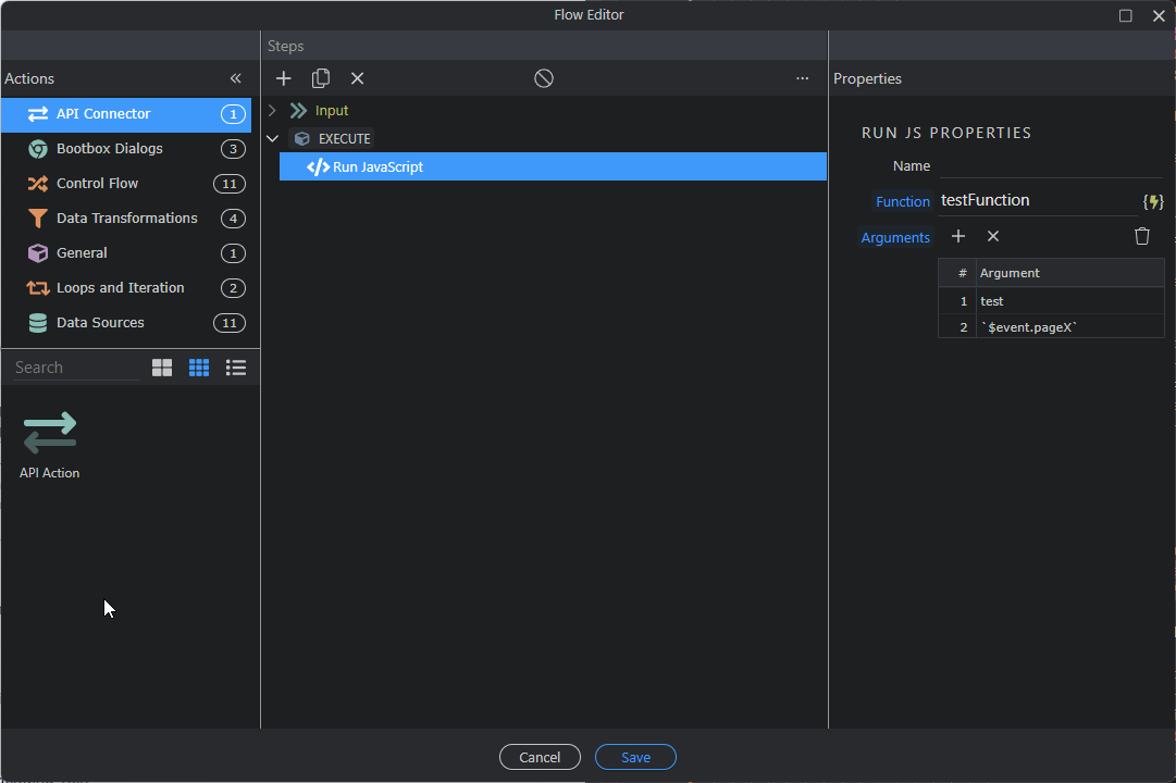 I used the UI to add a Dynamic Click, chose to use inline flow, added the runJS step. When adding arguments to the runJS you get the rogue quote at the start: