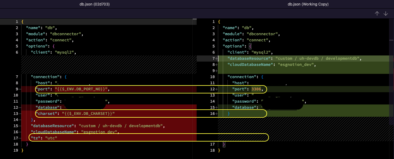 targetname/app/modules/connections/db.json - resets the Port No. from 9910 to 3306 if custom cloud databases are being used; removes charset utf8mb4; rearranges code lines