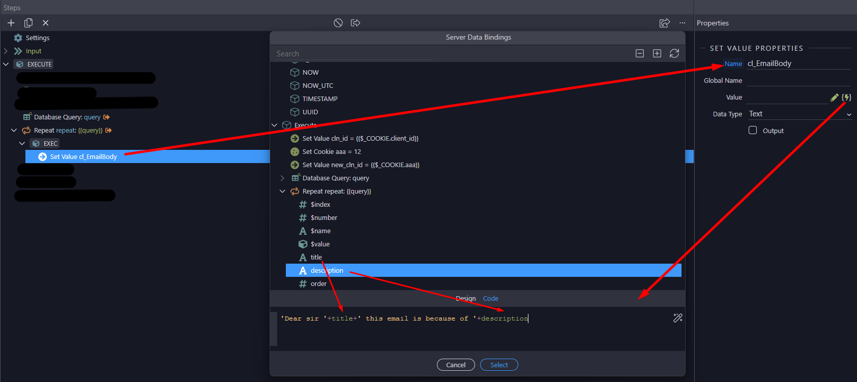 I didn't think of composing the email the way you just explained. I will now update the email template in the table to have static text only & the dynamic content I will link from the repeat/ query.