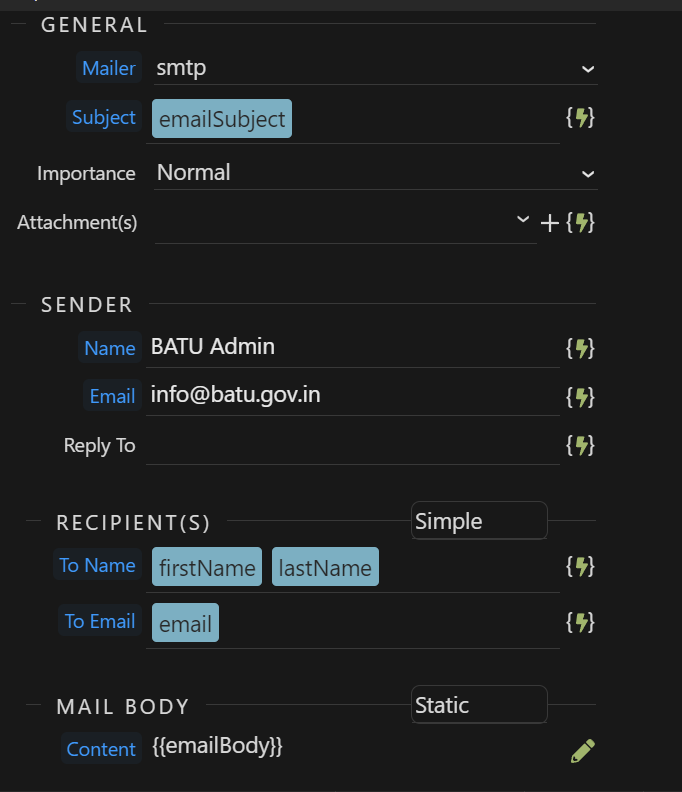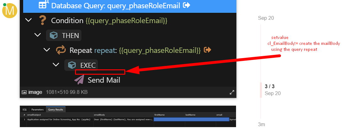 I saved the mail template in the table with dynamic content just to check whether I am able to deliver the mail based on phase ID & status ID. When I run the sendMail API, it sends the mail.
